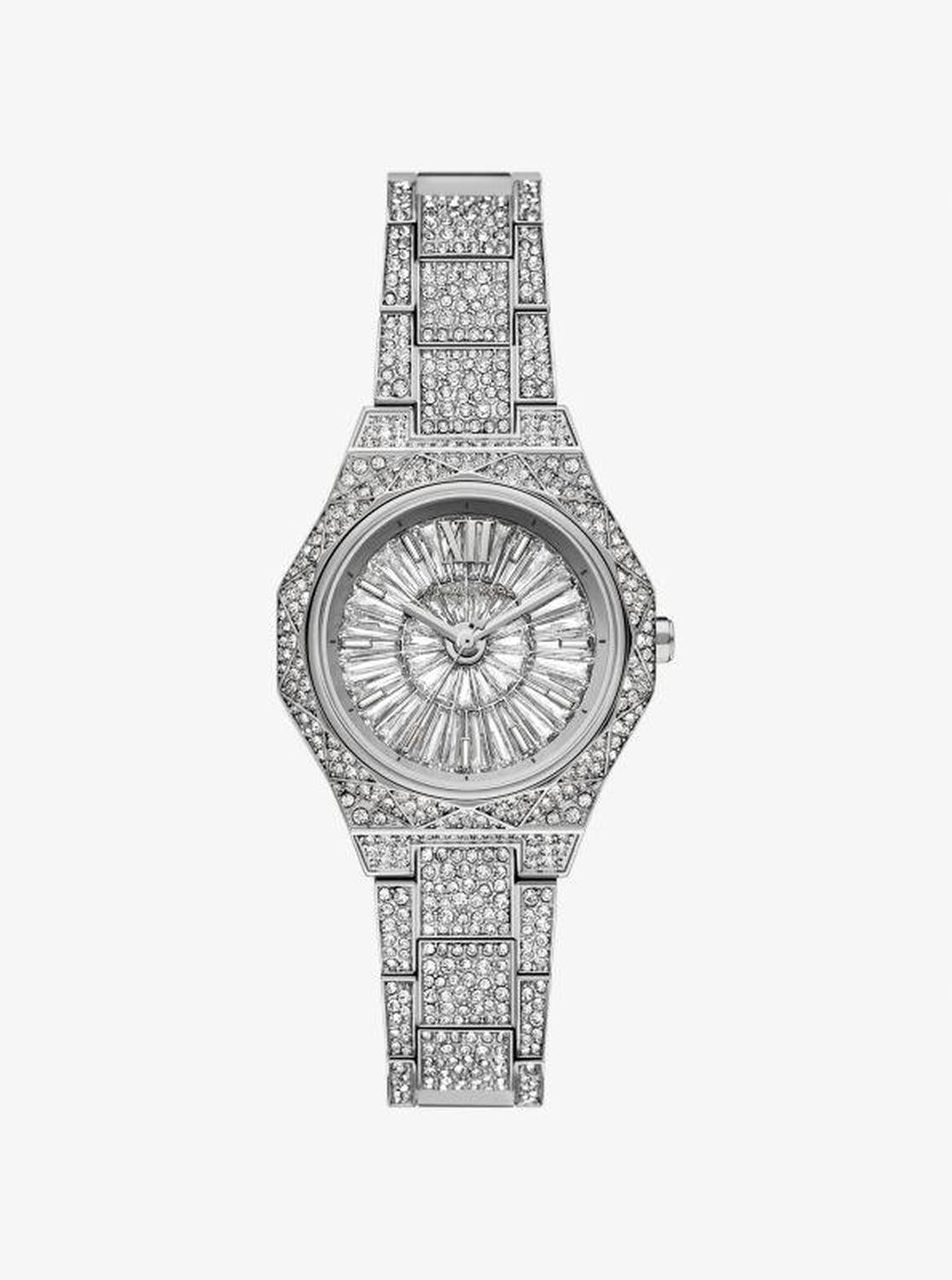 • Meet the Raquel: a showstopping timepiece destined to amp up any look. Featuring a beveled-crystal face and sparkling allover pavé, this silver-tone watch packs an art deco statement in a scaled-downsize. Wear yours with your favorite party dress for a glamorous night out.