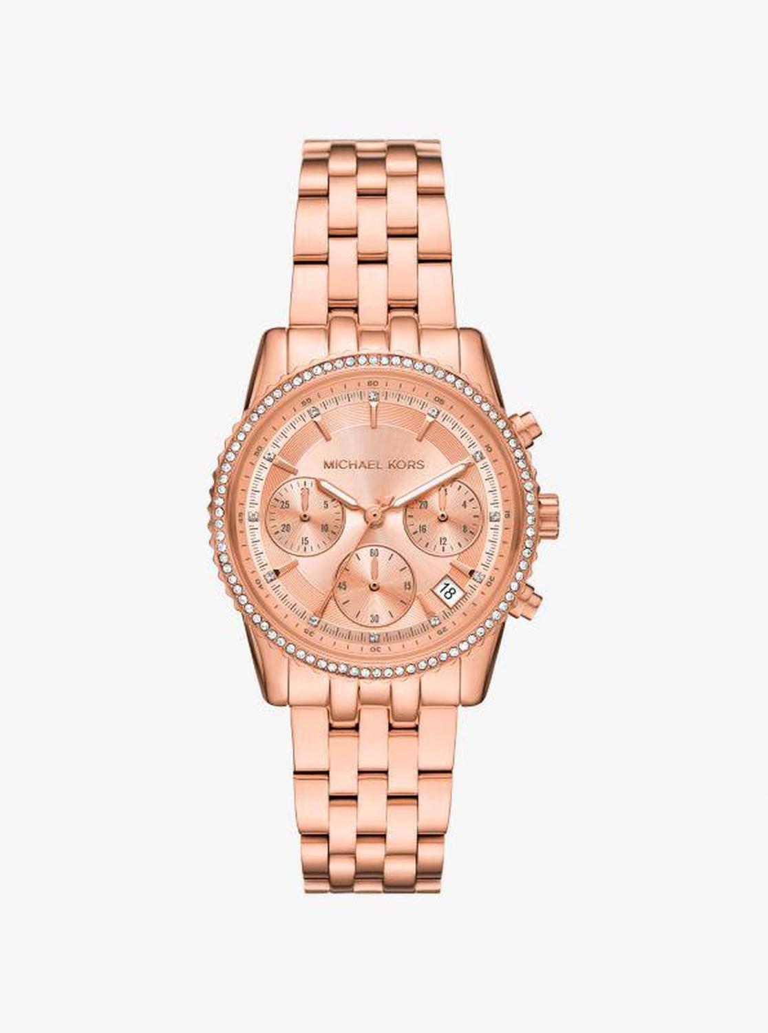 • Radiant and refined, the Ritz watch combines rose-gold-tone stainless steel with a menswear-inspired bracelet strap for a chic and timeless finish. The chronograph display lends functionality, while a pavé-studded bezel delivers a touch of shine.
