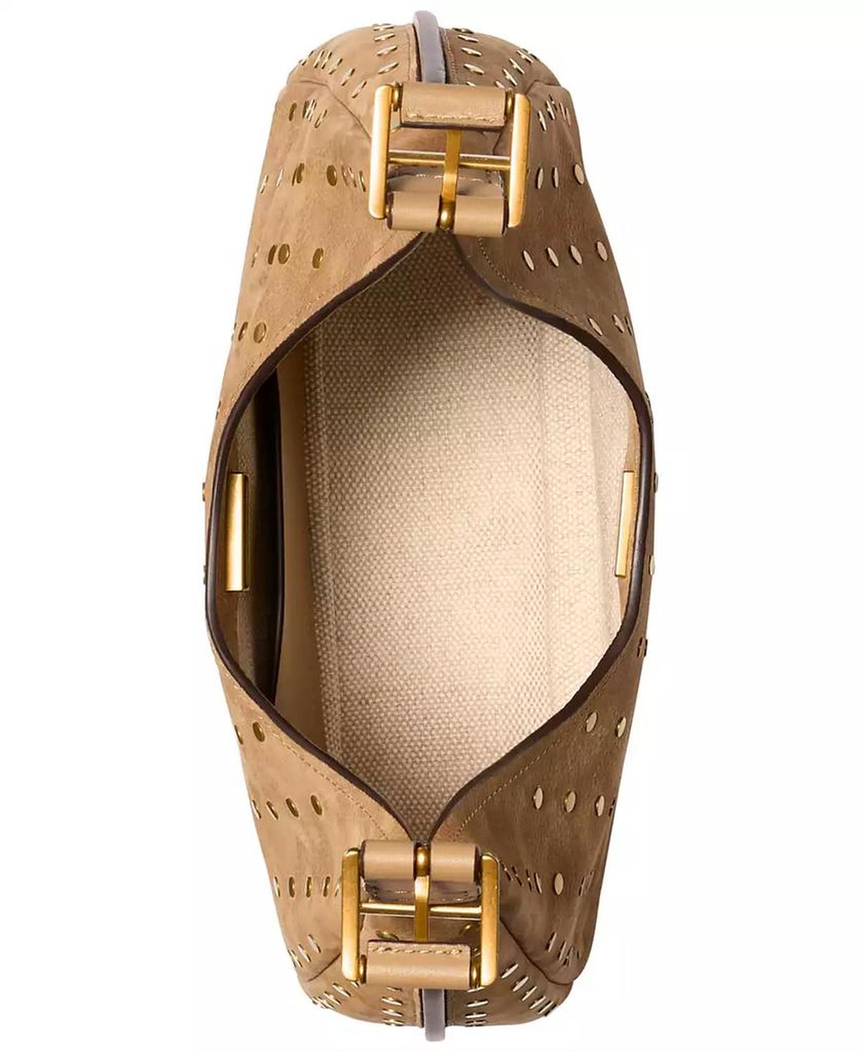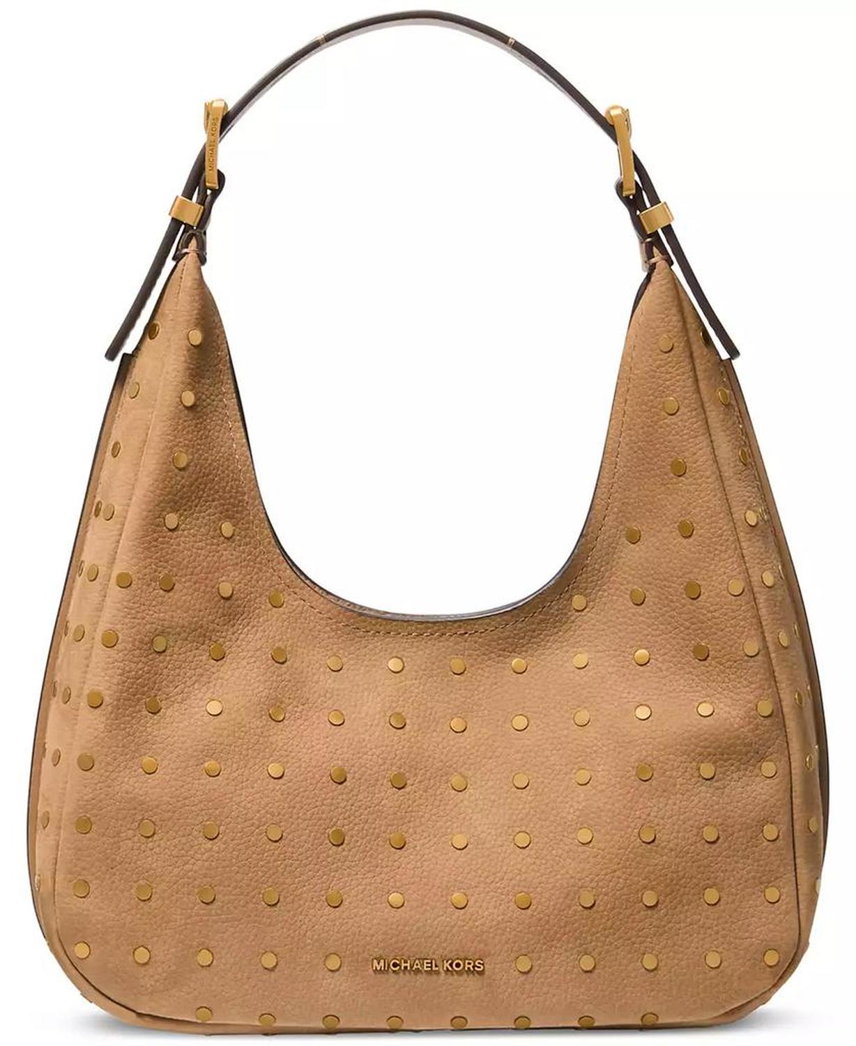 Crafted with pebbled leather embellished with allover rivets, this hobo by MICHAEL Michael Kors is a chic everyday accessory you'll reach for again and again. Small-sized bag; 9-1/2"W x 9-3/4"H x 3-1/4"D (width is measured across the bottom of handbag); 0.75 lbs. approx. weight Silhouette is based off 5'9" model 8-1/2"L handle Magnetic snap closure Gold-tone hardware, logo & allover rivets, interior slip pocket Leather; lining: 55% polyester, 45% linen Spot clean Imported