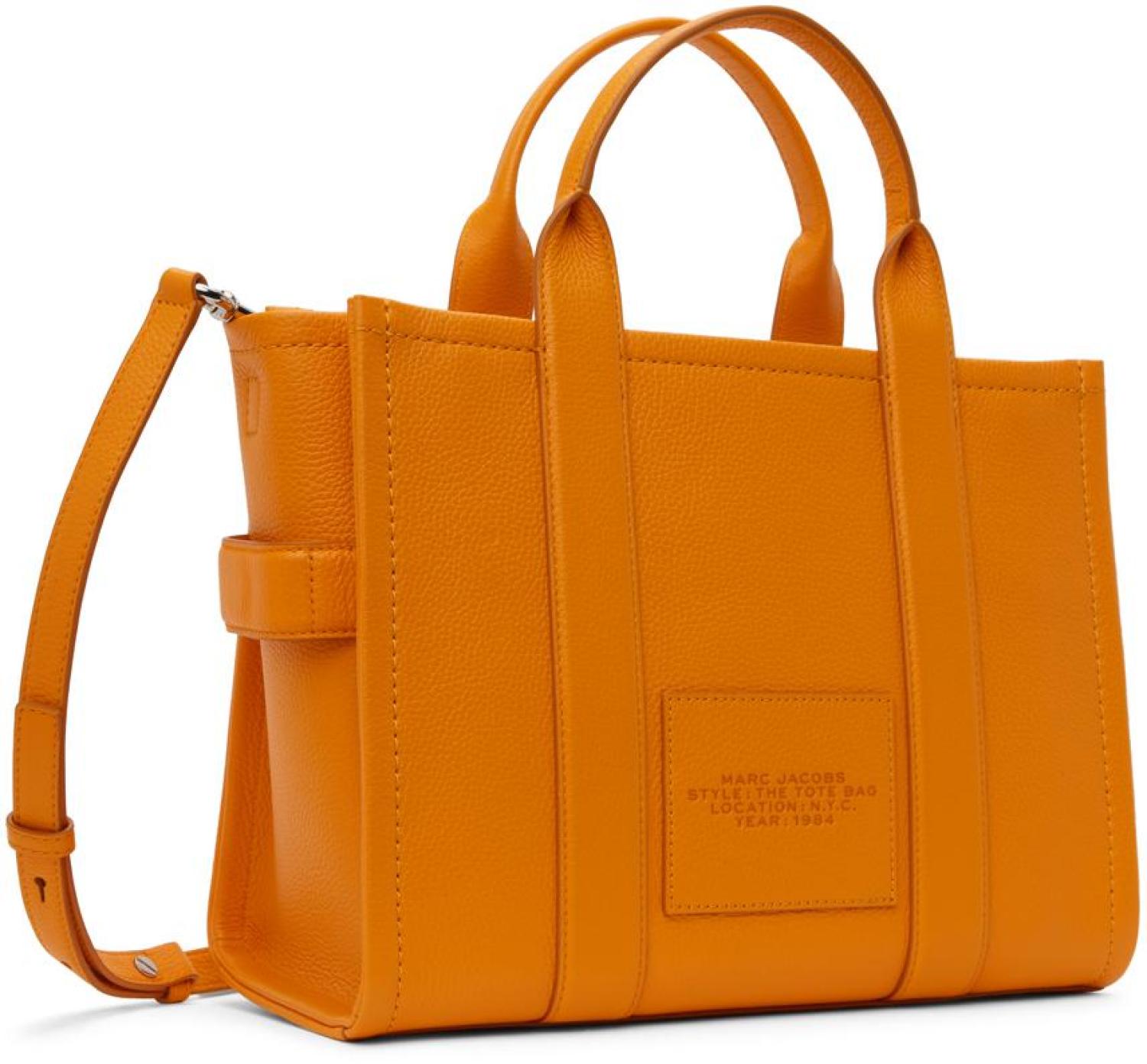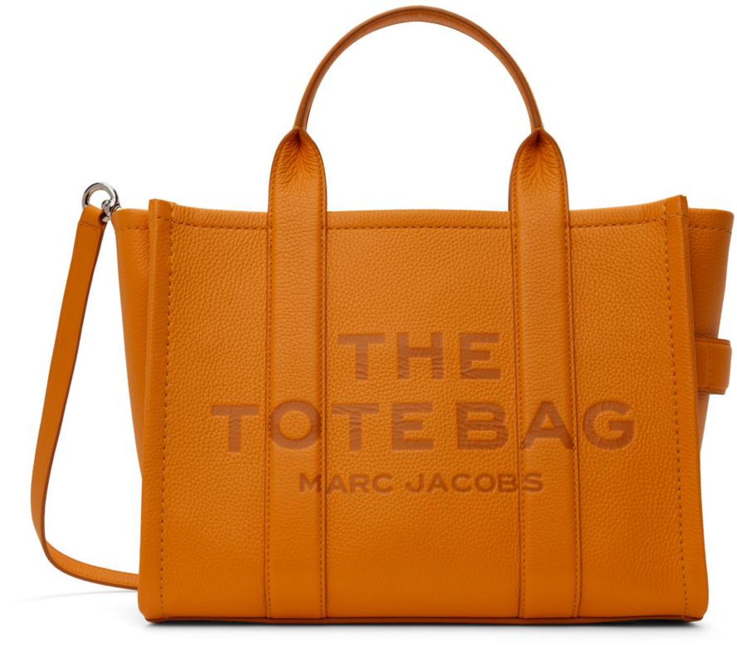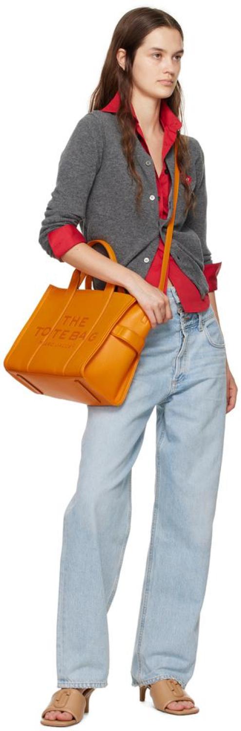 Marc Jacobs Orange 'The Leather Medium' Tote Grained leather tote in orange. · Twin rolled carry handles · Adjustable and detachable crossbody strap · Logo embossed at face · Embossed logo patch at back face · Carry handle at side · Zip closure · Card slot at interior · Patch pockets and zip pocket · Buffed leather and twill lining · Logo-engraved silver-tone hardware · H10" x W13" x D5.75" Supplier color: Tangerine 100% leather. Made in Viet Nam. 242190F049033