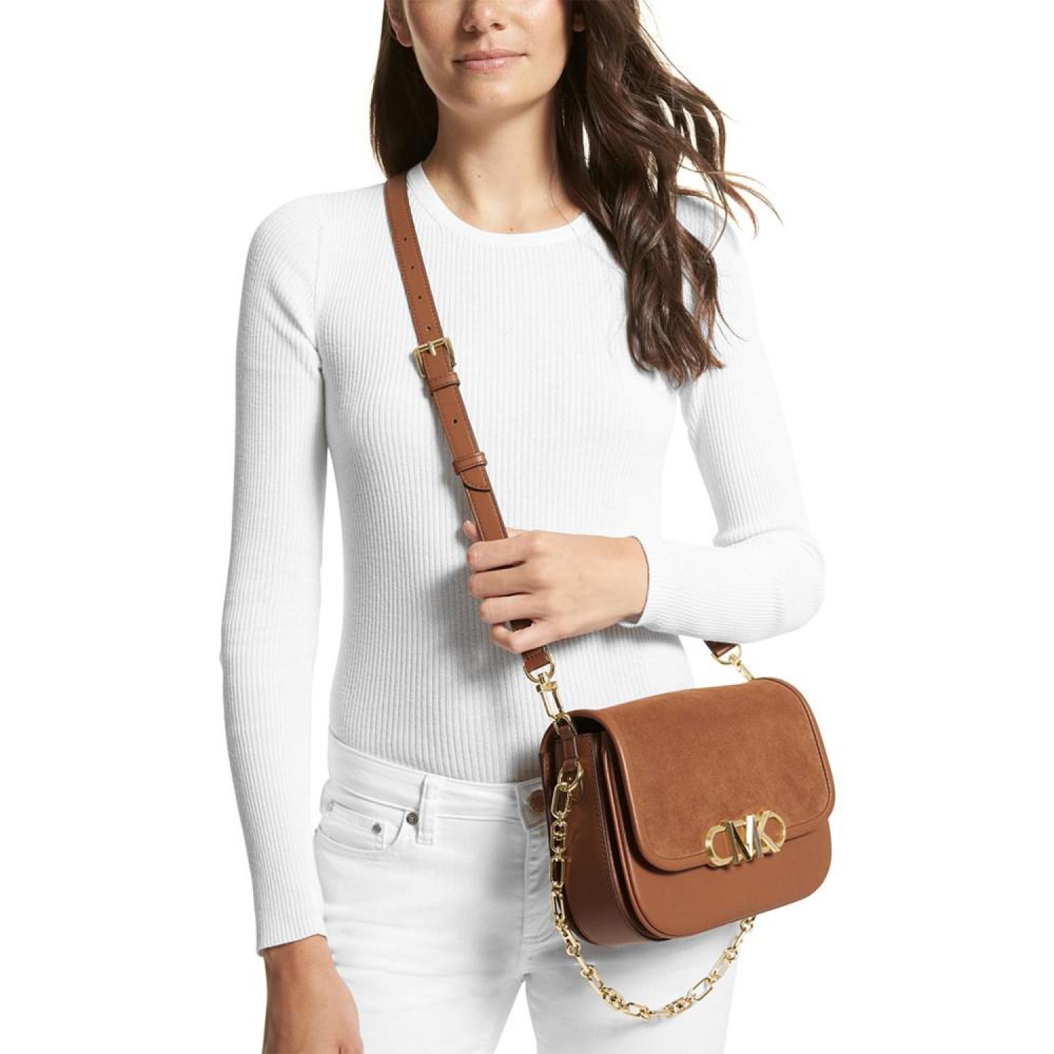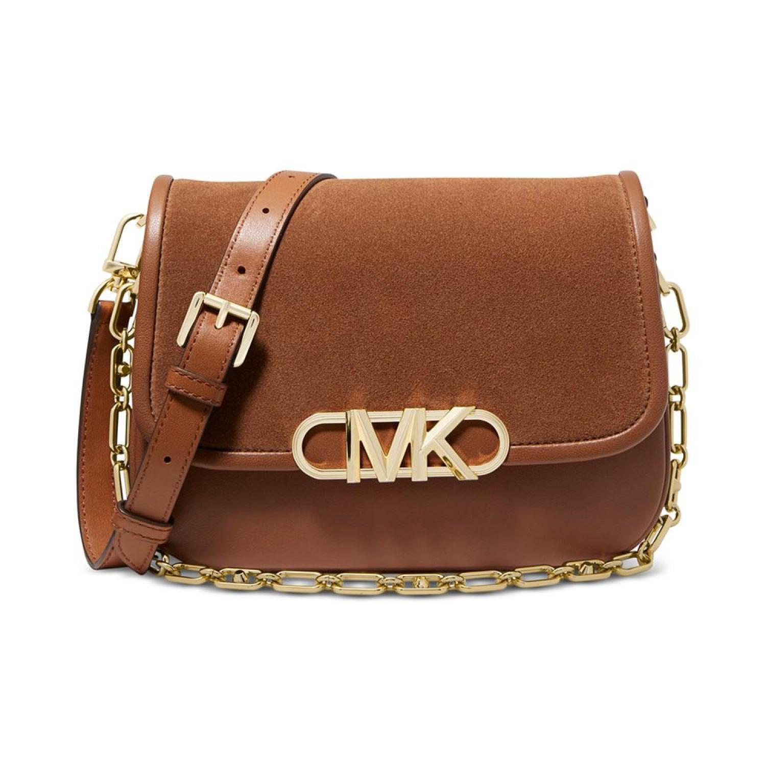 Featuring a gleaming logo and adjustable crossbody strap, the Parker by MICHAEL Michael Kors refines any look. Small sized bag; 9-3/4"W x 7"H x 3-3/4"D (width is measured across the bottom of handbag); 1.52 lbs. approx. weight Silhouette is based off 5'9" model 17"L adjustable strap Flap with snap closure Gold-tone hardware Interior slip pockets Leather; lining: polyester Spot clean Imported