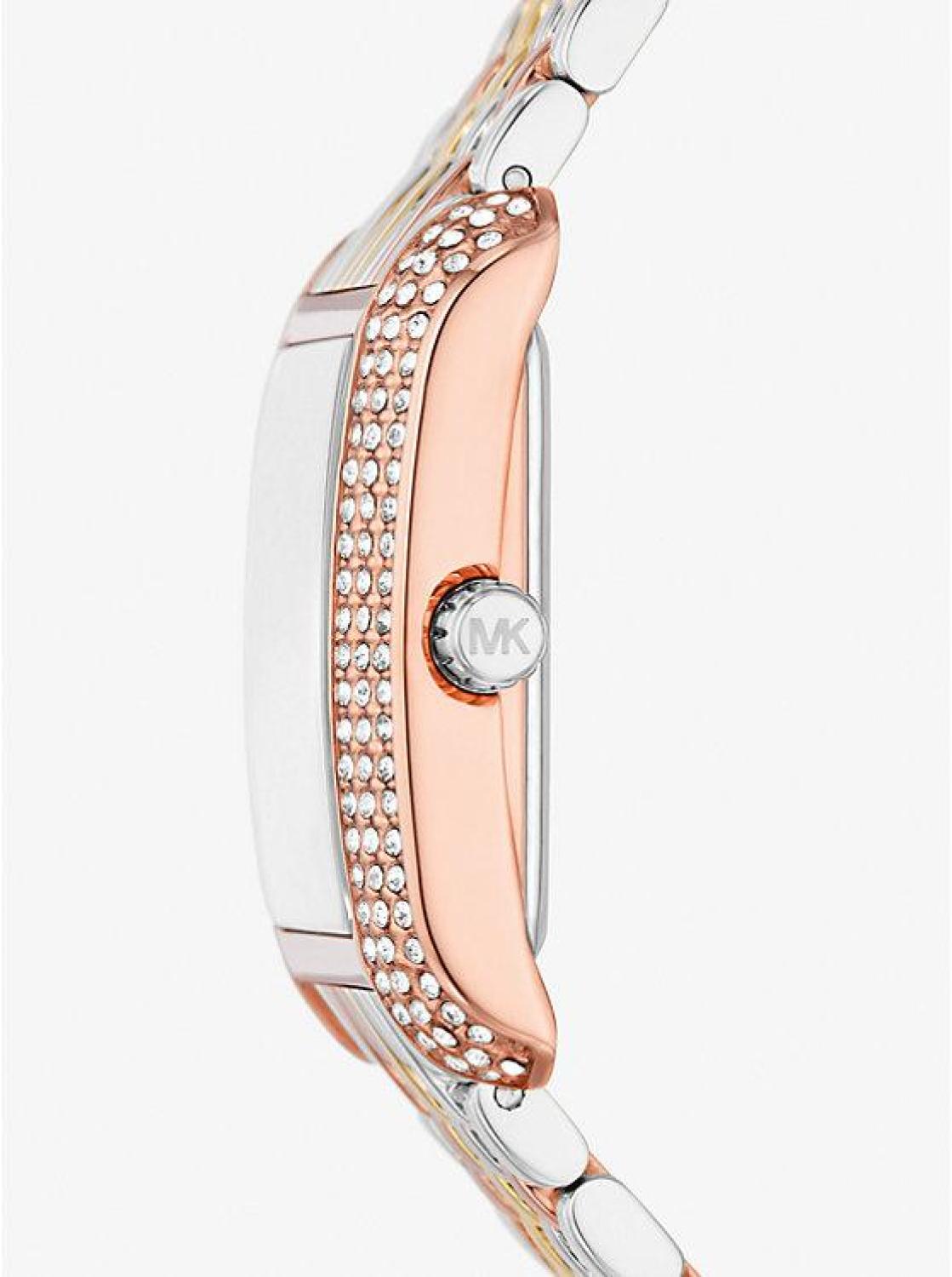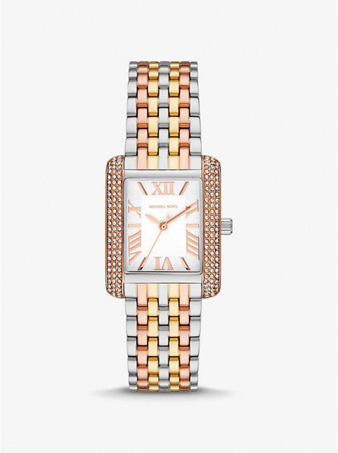 Side panels of understated pavé crystals add shine to the rectangular face of our petite Emery watch. The polished beveled strap beautifully weaves together gold-, rose gold-, and silver-tone stainless steel, while the dial features Roman numeral indexes for a luxurious finish. Glamorous enough to pair with evening looks yet understated enough to complement a simple T-shirt and jeans, this is a timeless style you’ll never want to take off. • Petite watch • Stainless steel • Rose gold-tone/silver-tone/gold-tone hardware • Pavé topring • Petite • 27mm case • Quartz/3-hand movement • Clasp fastening • Water resistant up to 5 ATM • 2-year warranty • Imported • Petite watch • Stainless steel • Rose gold-tone/silver-tone/gold-tone hardware • Pavé topring • Petite • 27mm case • Quartz/3-hand movement • Clasp fastening • Water resistant up to 5 ATM • 2-year warranty • Imported