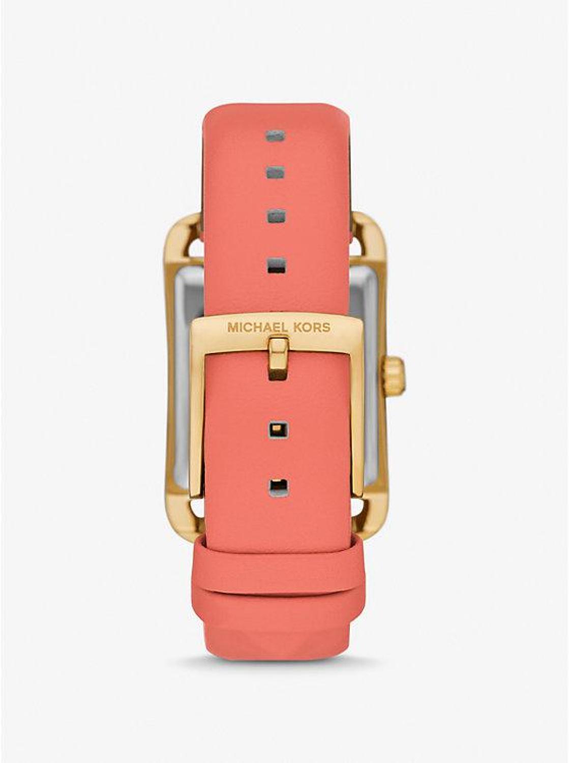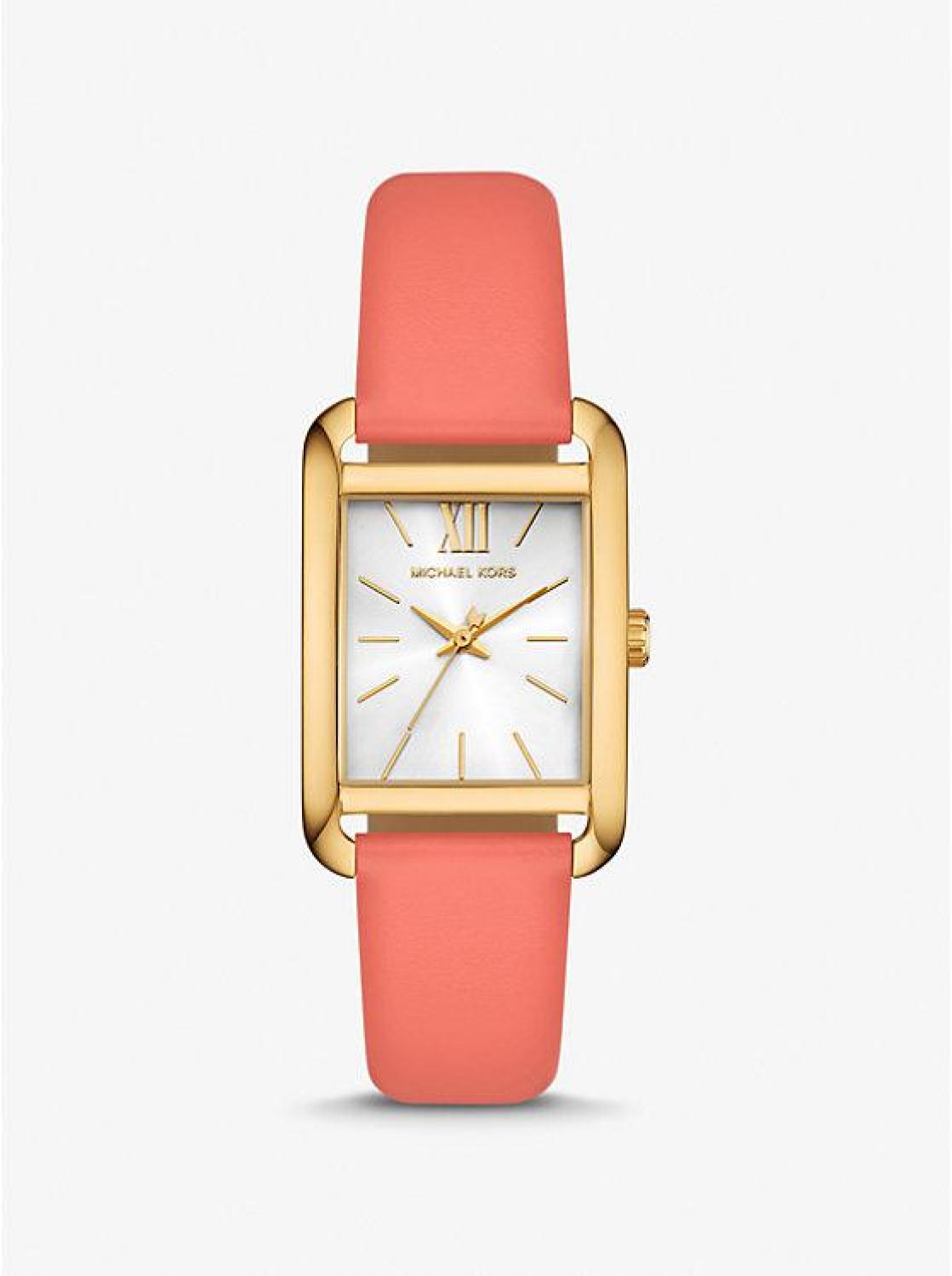 • The petite Monroe watch embodies modern glamour. Made from gold-tone stainless steel with a smooth leather strap, it features minimalist time stops and a sleek profile that sits daintily on the wrist. Dress it up by stacking it with similar pieces, or keep things simple and wear it solo.