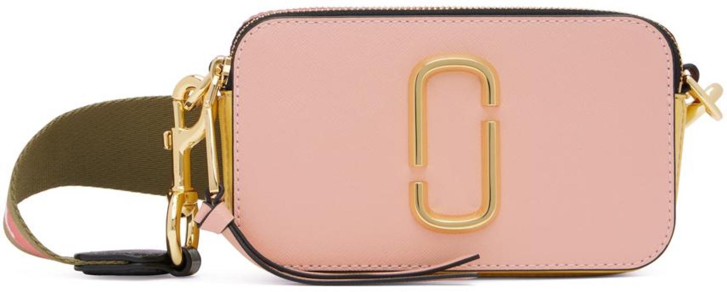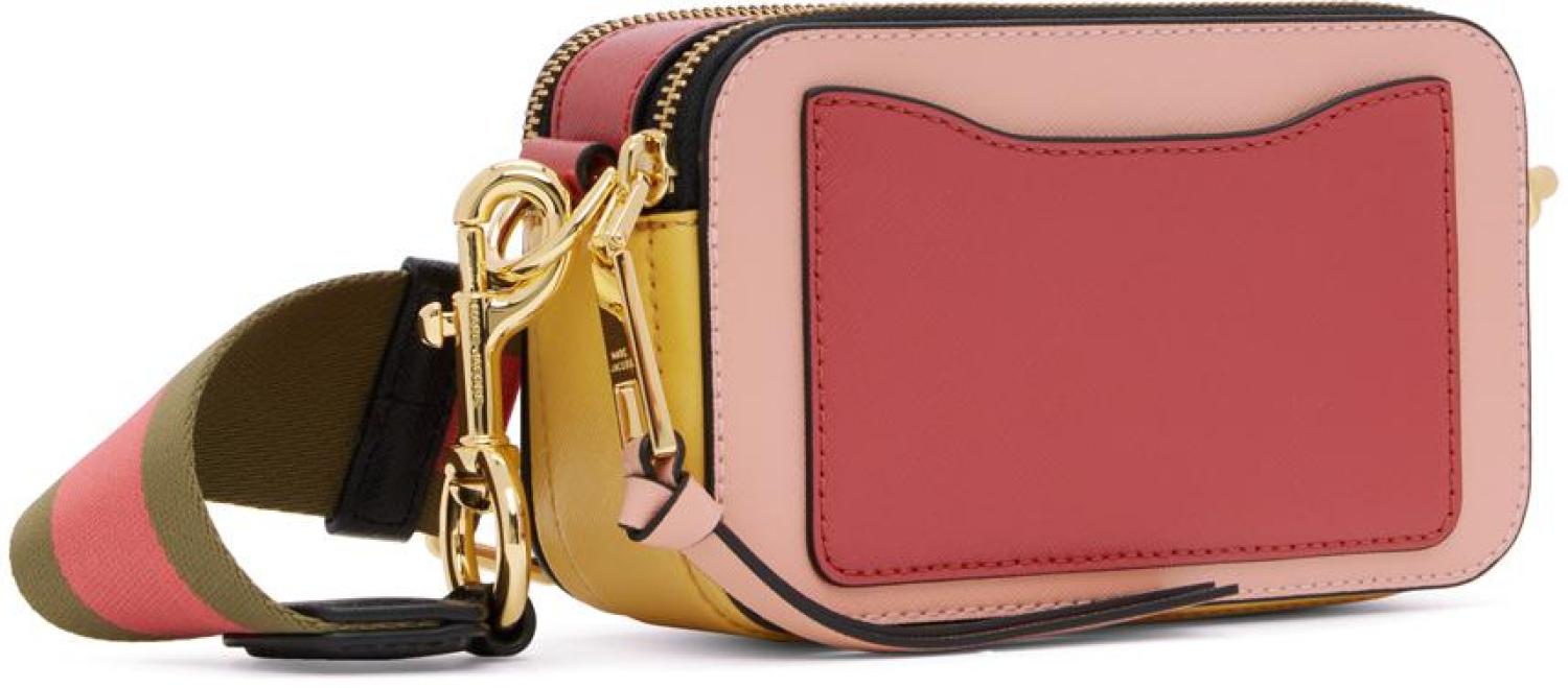 Marc Jacobs Pink 'The Snapshot' Bag Saffiano leather shoulder bag colorblocked in pink, red, and yellow. Logo hardware at face. · Detachable and adjustable logo-woven webbing shoulder strap · Logo embossed at top · Patch pocket at back face · Zip closures at two-compartment interior · Patch pocket at interior · Cotton faille lining · Gold-tone hardware · H5 x W8 x D3 in Supplier color: New rose multi Leather. Made in Viet Nam. 231190F048020