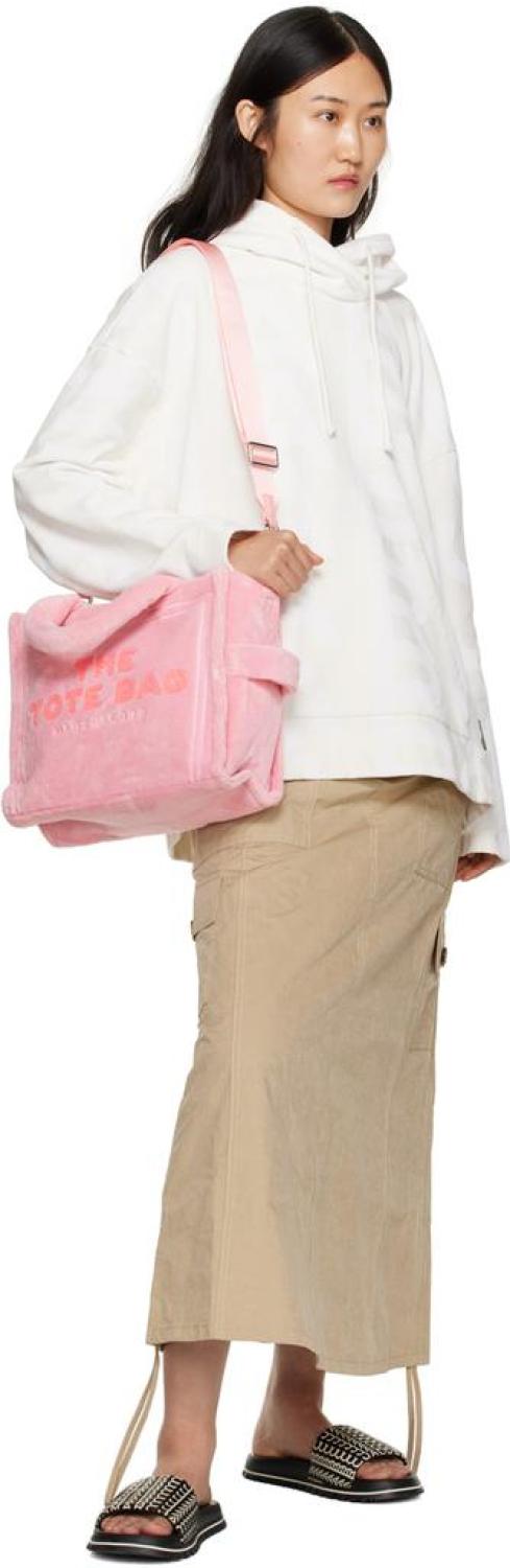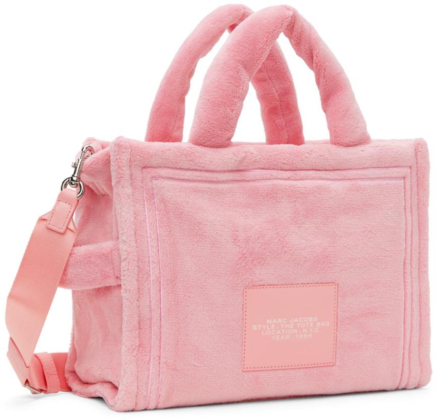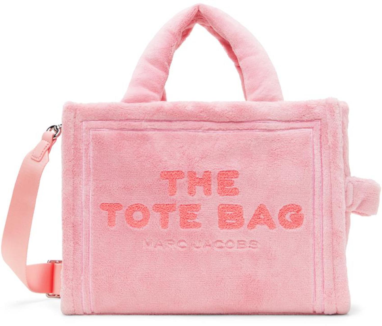 Terrycloth tote in pink. Intarsia logo and text at face.