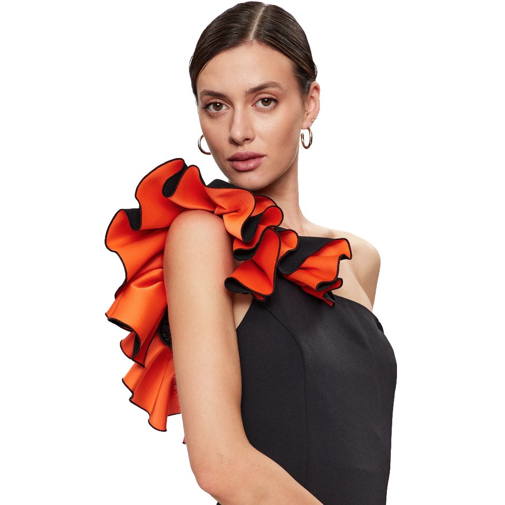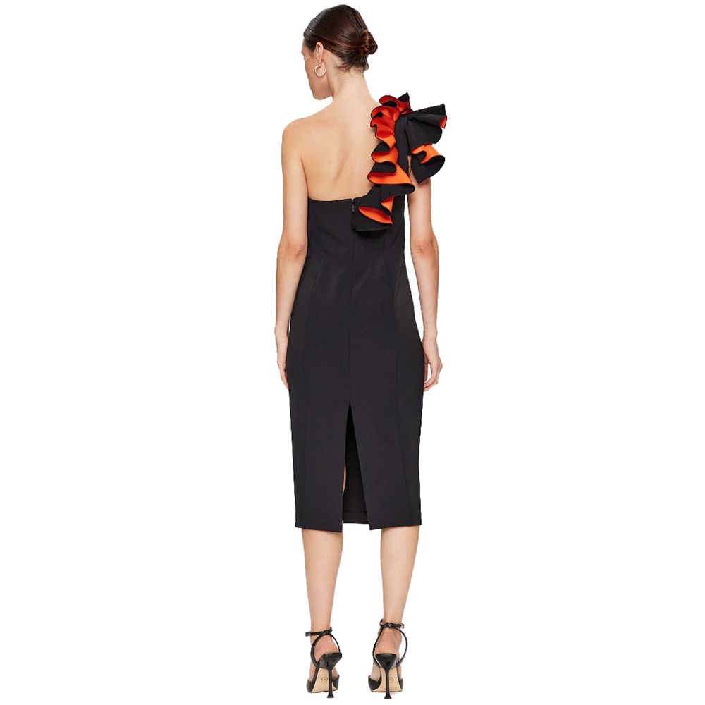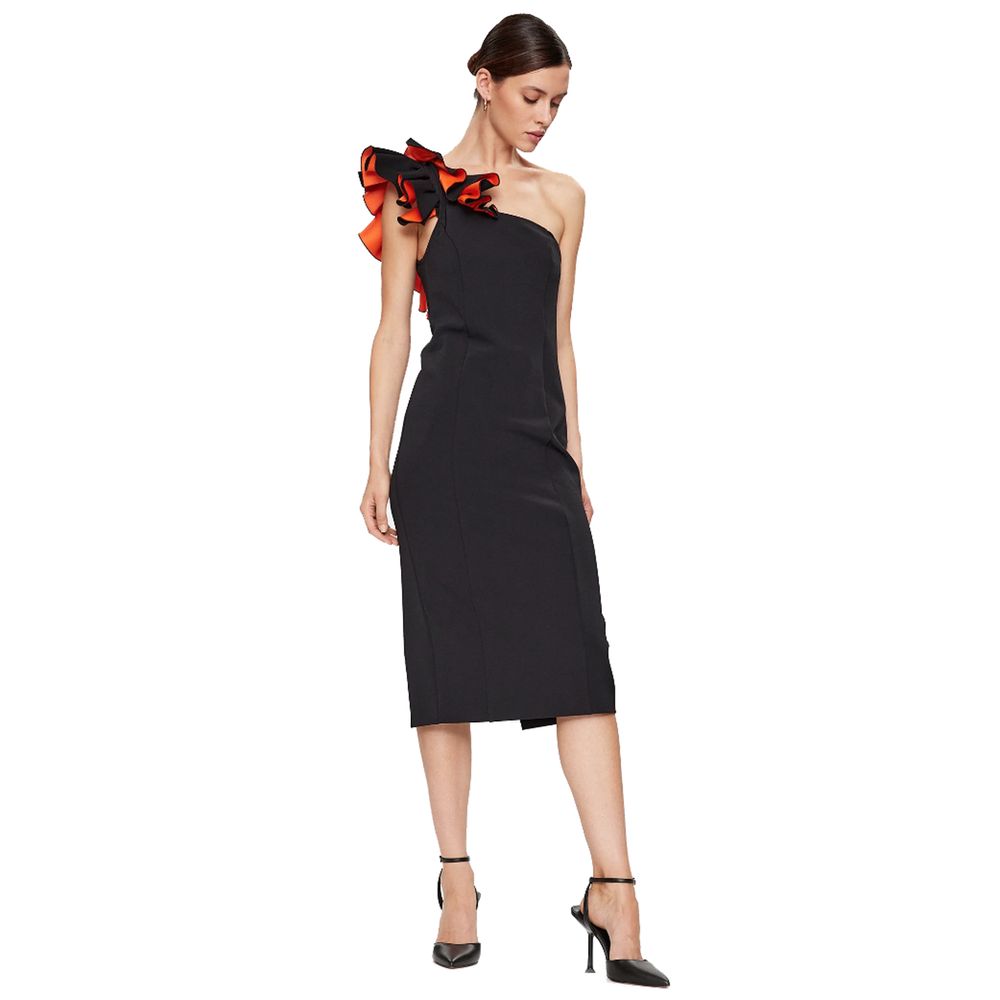 • Pinko sleeveless crepe dress with draped decoration on one shoulder, zip fastening on the back