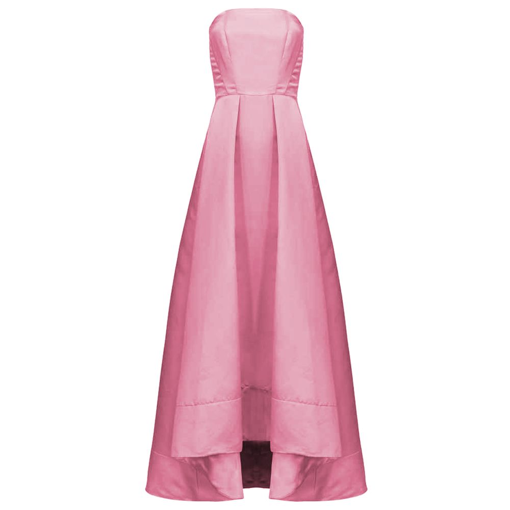Pinko long sleeveless dress in shiny duchesse fabric with strapless neckline, high-waisted seam, full skirt with slightly high-low hem and side pockets with internal seam. Zip closure at the center back.