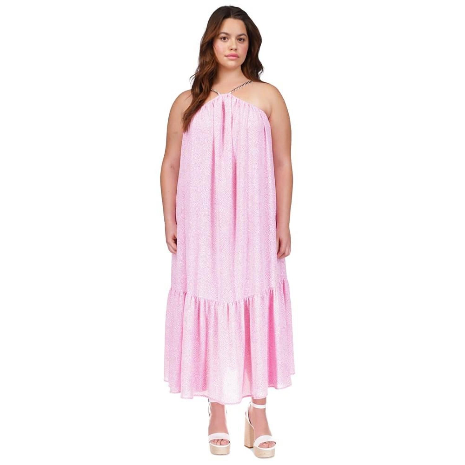 Make a statement in style with this plus size MICHAEL Michael Kors breezy maxi dress featuring chic chain strap detailing, perfect for effortless elegance on any occasion. Approx. 50-1/2" long from center front neck to hem Ankle-length or longer casual dress Asymmetric neckline; Maxi silhouette Pulls on Chain straps Tiered at hem; textured petal print Lined Polyester/elastane; lining: polyester Machine washable Imported