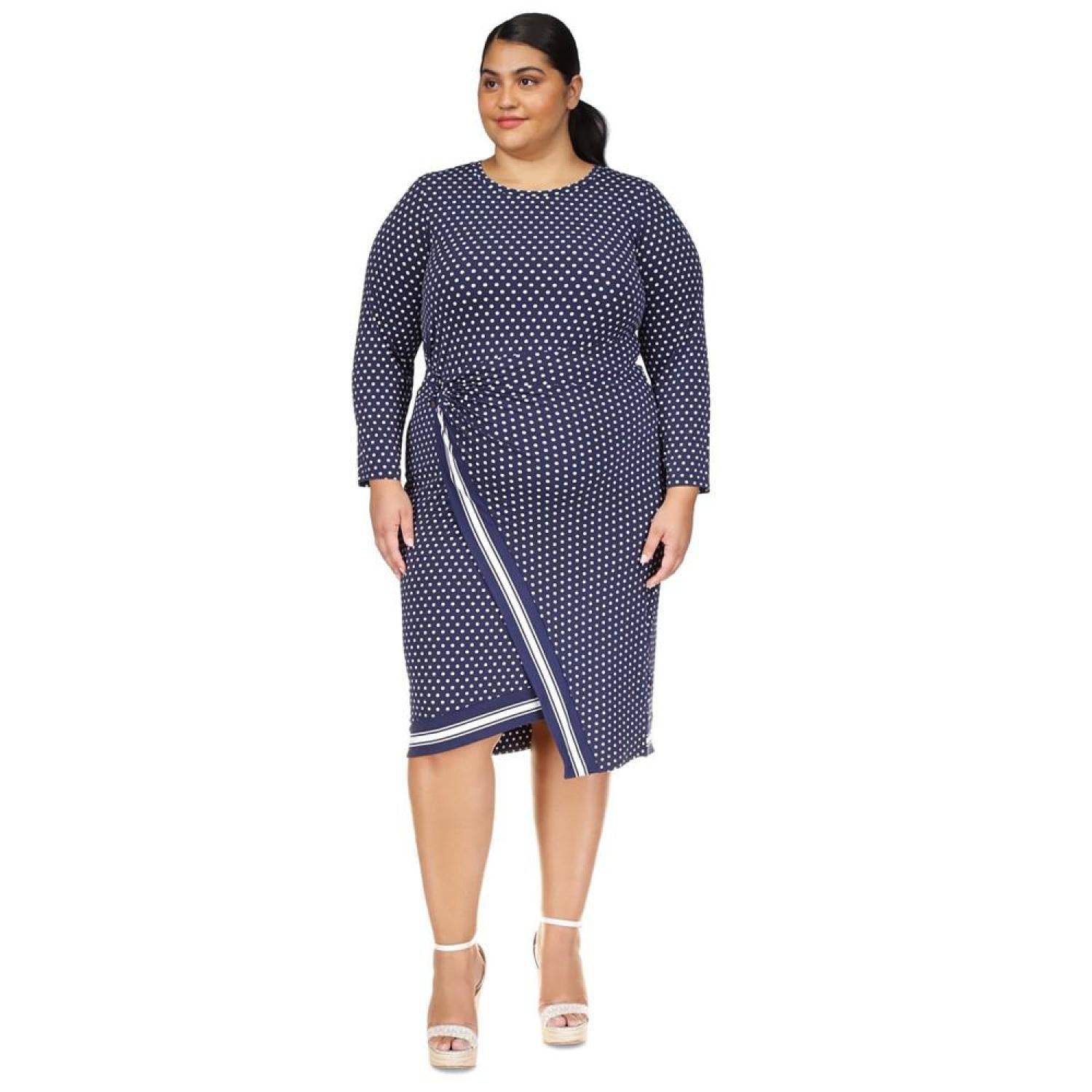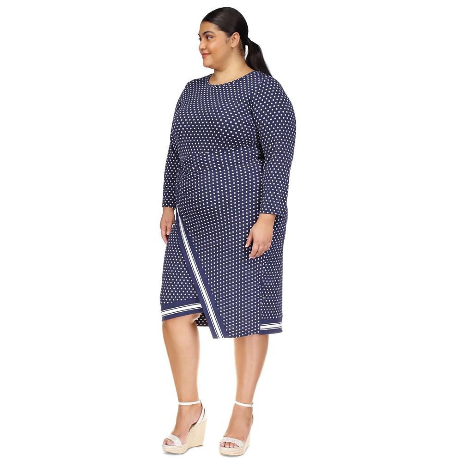 Keep it cute in this polka-dot plus size dress from MICHAEL Michael Kors, featuring a flattering faux-wrap design. Approx. 46-1/2" long from center back neck to hem Falls below the knee to lower calf Round neckline; Midi silhouette Long sleeves Faux-wrap design; asymmetric hem Unlined Polyester, elastane Machine wash or dry clean Imported