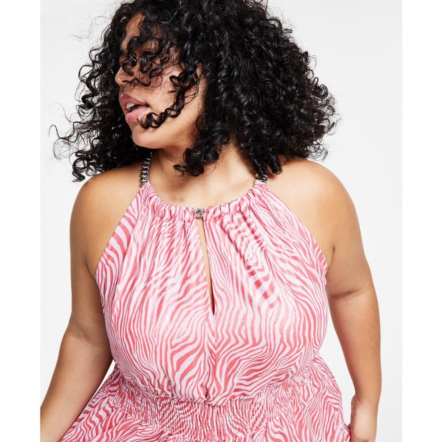 • A feminine print on chiffon, this plus size halter dress by MICHAEL Michael Kors flaunts a chain accented neckline and flattering smocked waist design.