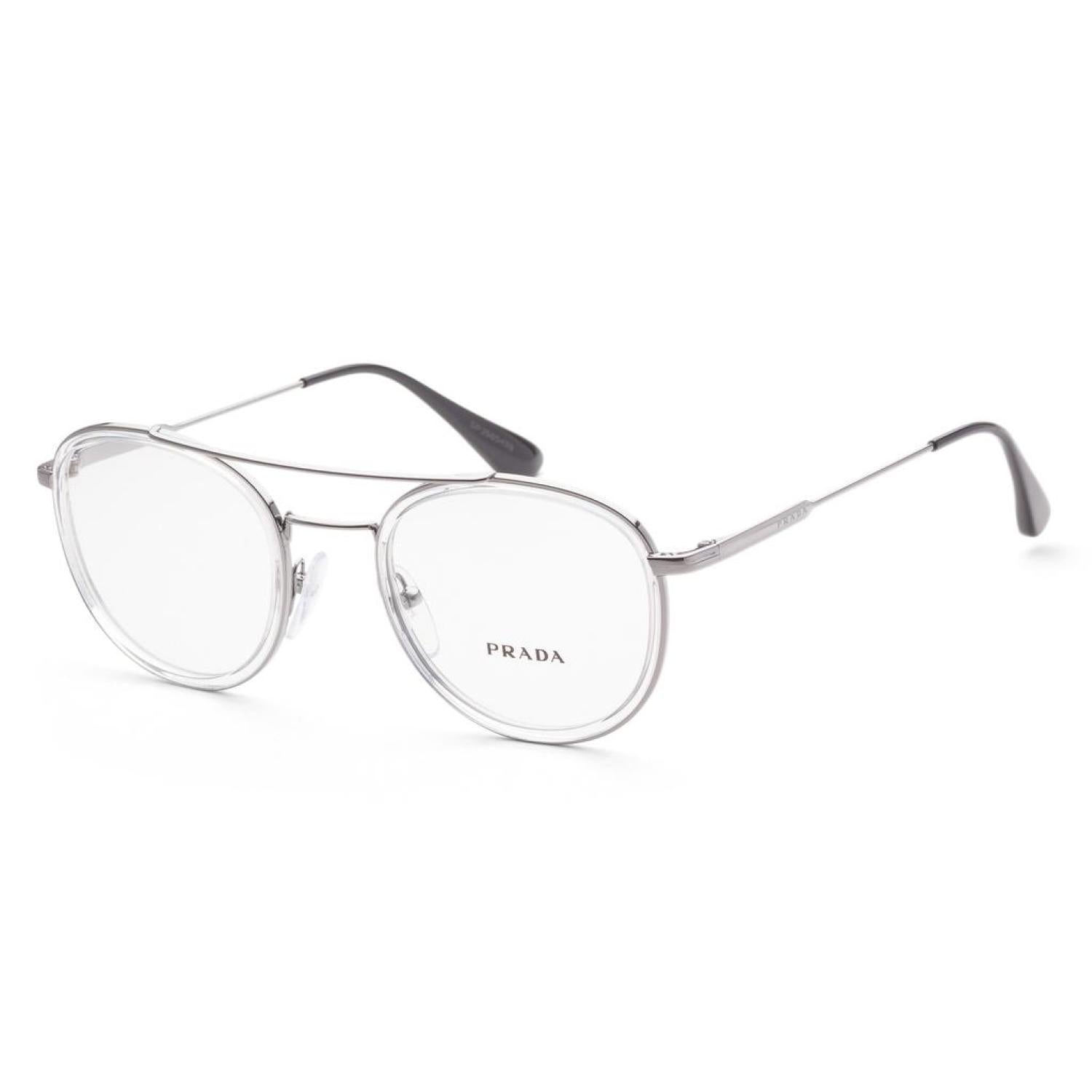 • The Prada men's Opticals measure at 49 mm lens width, 22 mm bridge width, and 140 mm arm length. The frame is round-shaped transparent gunmetal metal. Made in Italy (PR-66XV-07A1O1)