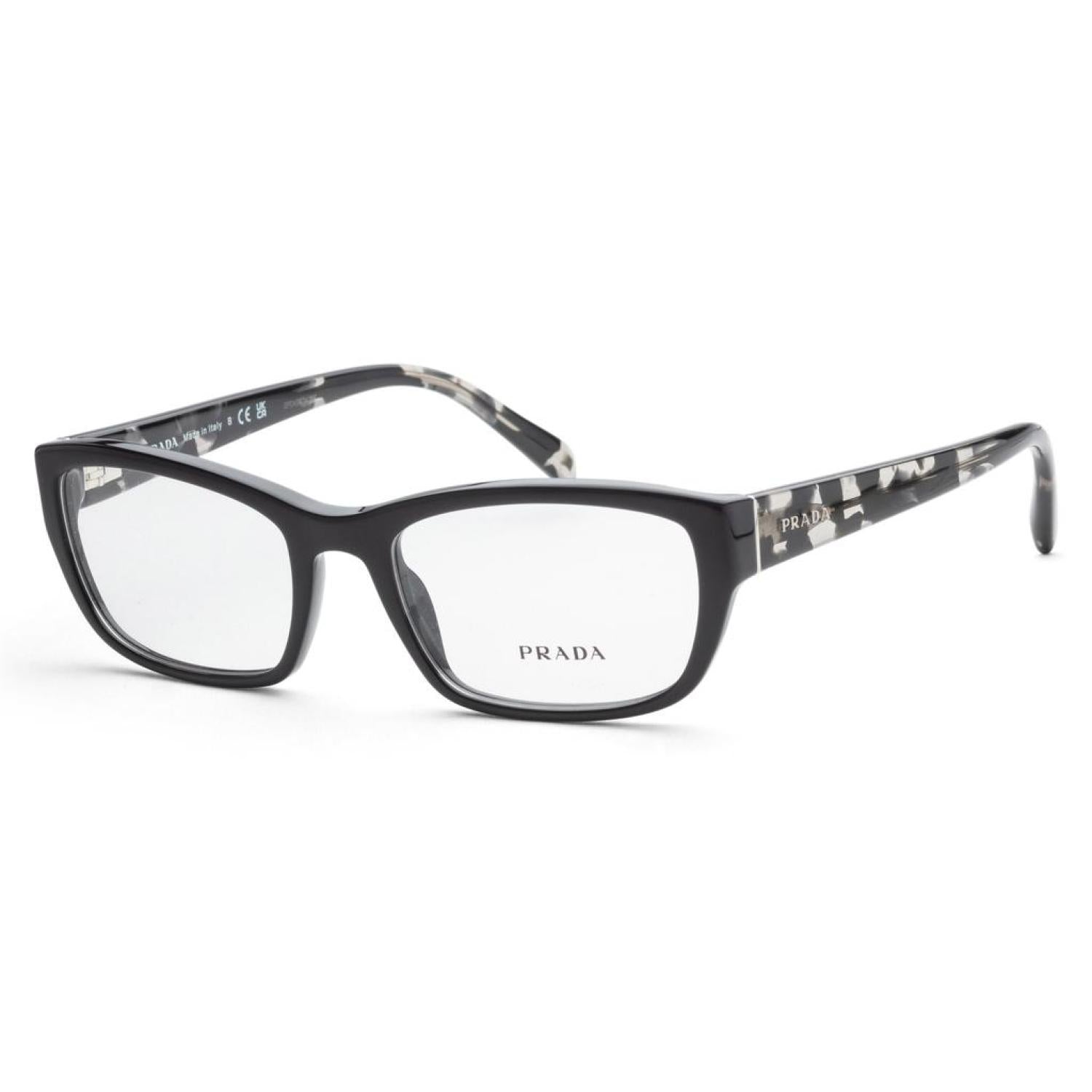 The Prada women's Opticals measure at 52 mm lens width, 18 mm bridge width, and 135 mm arm length. The frame is rectangular-shaped black acetate. Made in Italy (PR-18OV-07E1O1-52)