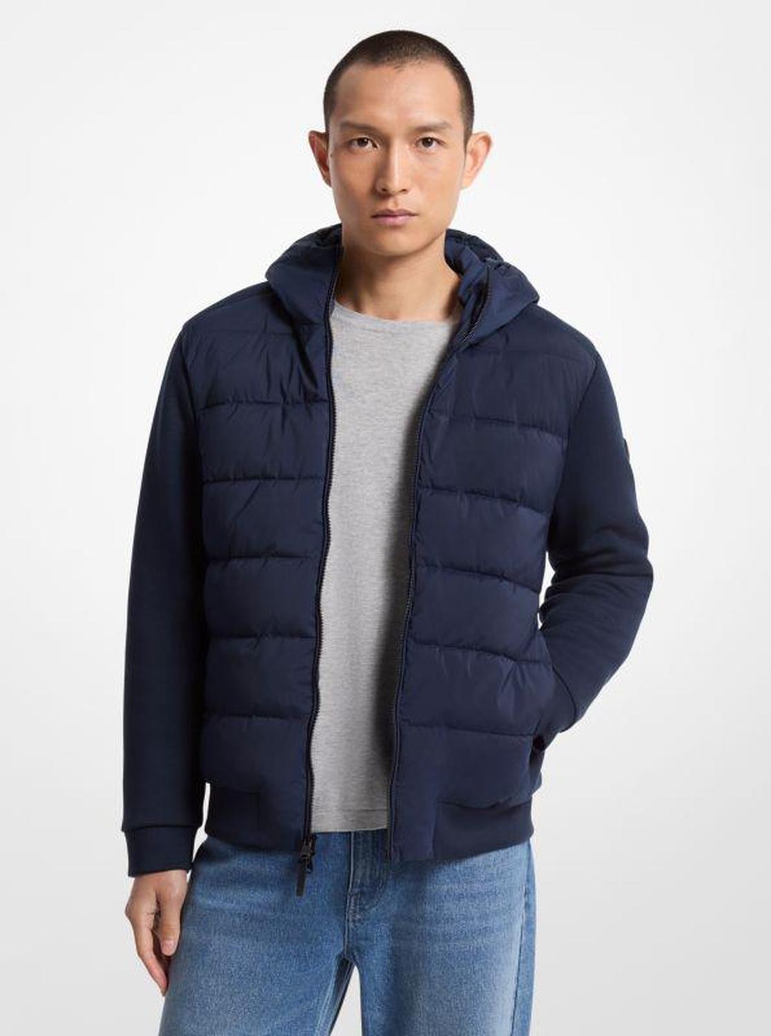 • This mixed-media jacket is the style to turn to when the temperature shifts. It’s made with a water-resistant shell that’s quilted for warmth and fitted with handy zip pockets and a hood.