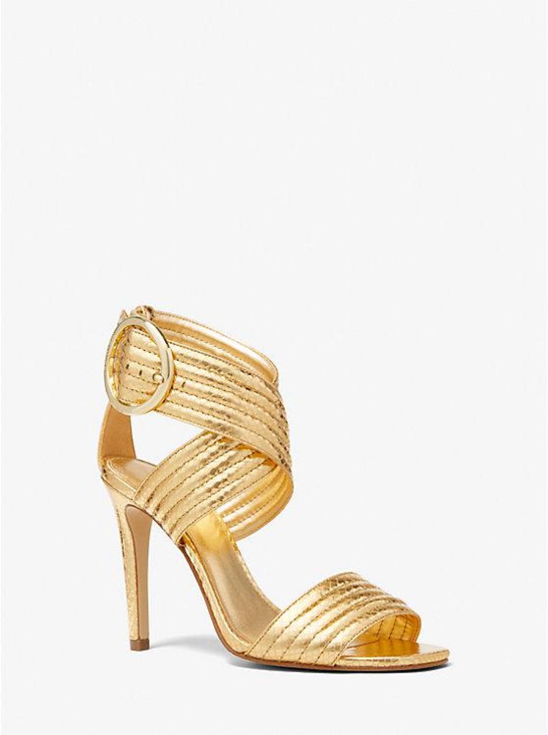 The Remi sandal exudes glamour in metallic snake-embossed leather constructed with quilted crossover straps and an oversized buckle. Finished with a sleek stiletto heel, this style is your shortcut to fabulous.