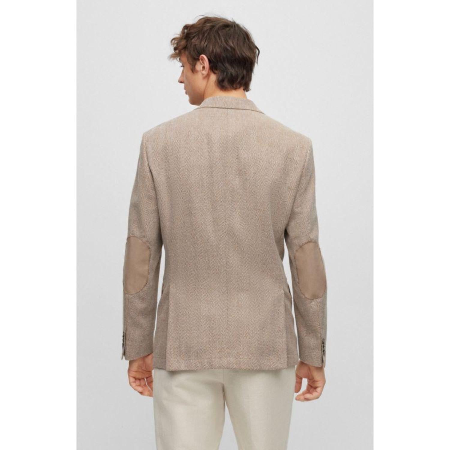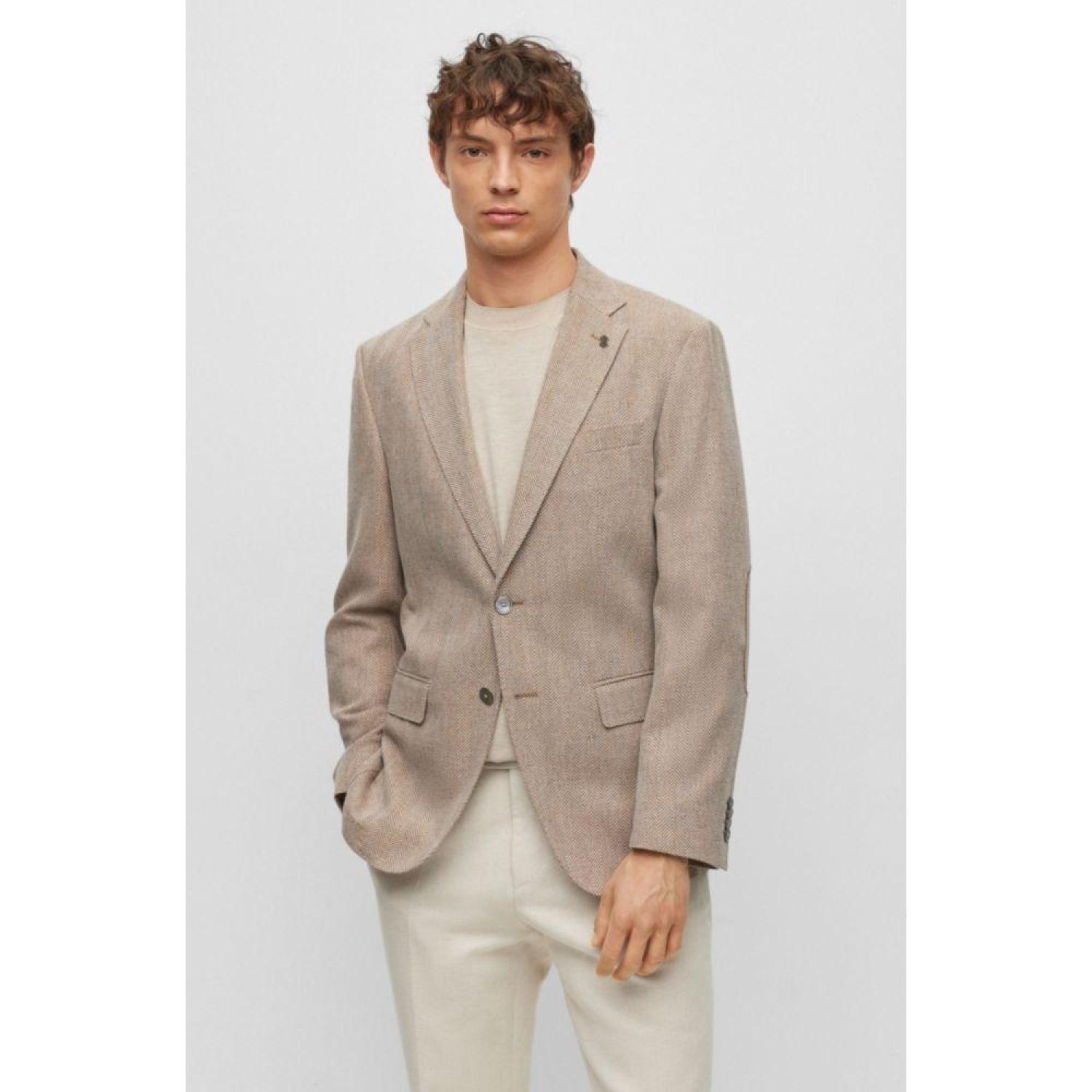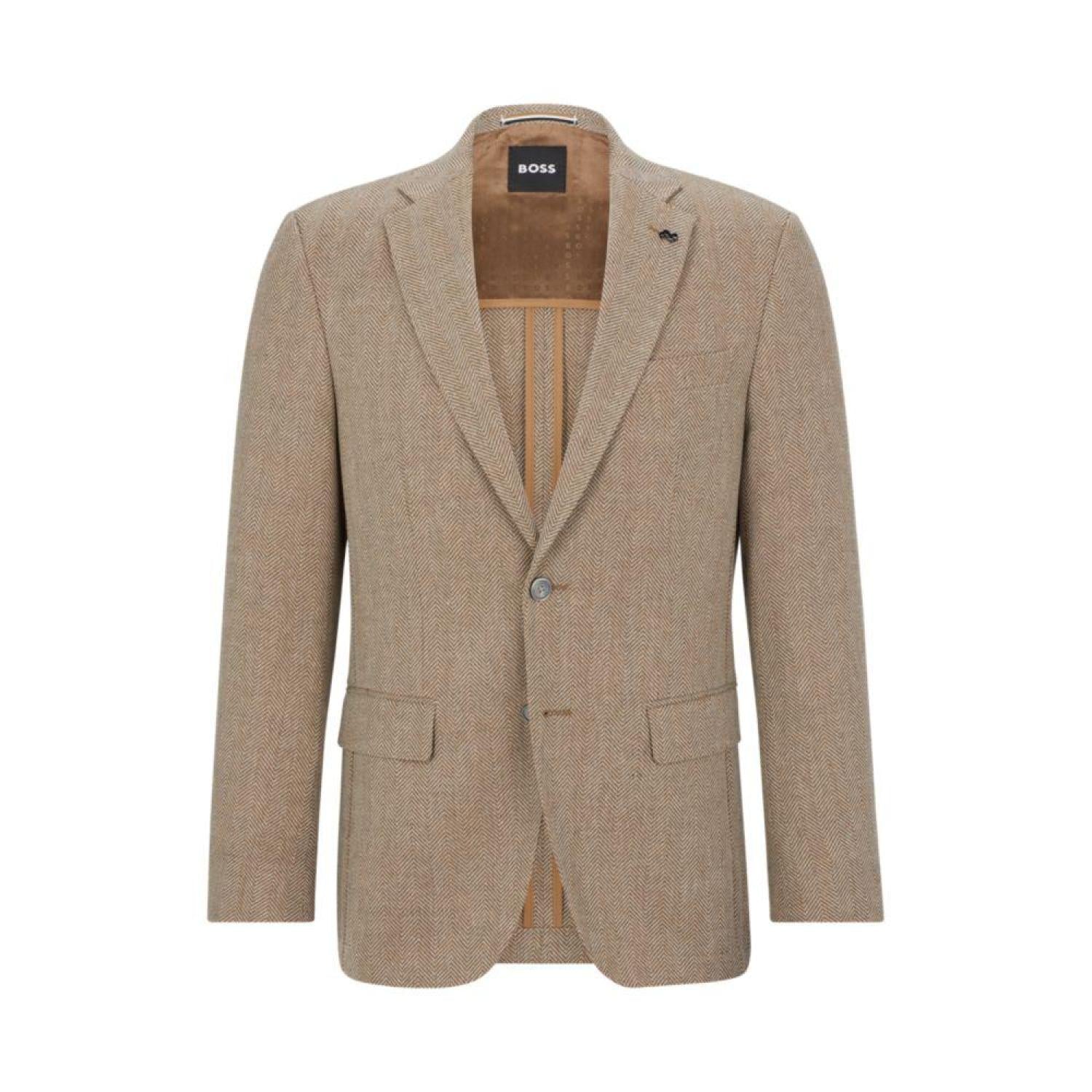 • A slim-fit jacket in herringbone cloth made from cotton and virgin wool by BOSS Menswear, trimmed with a monogram lapel pin.