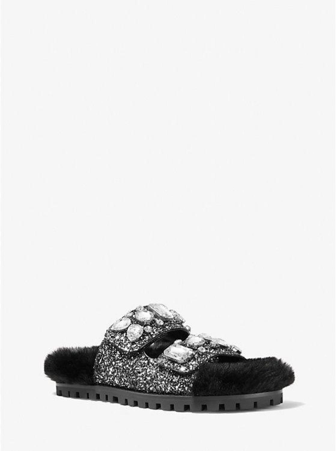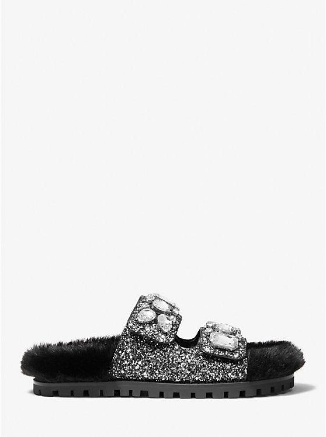 Stark Embellished Glitter and Faux Fur Slide Sandal