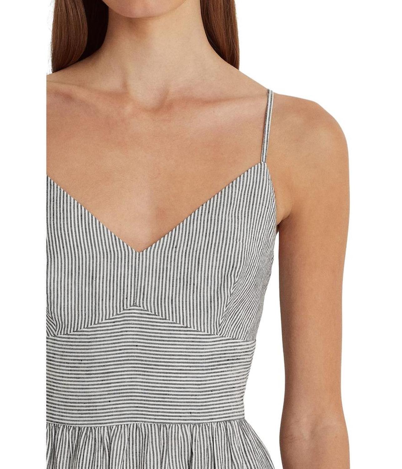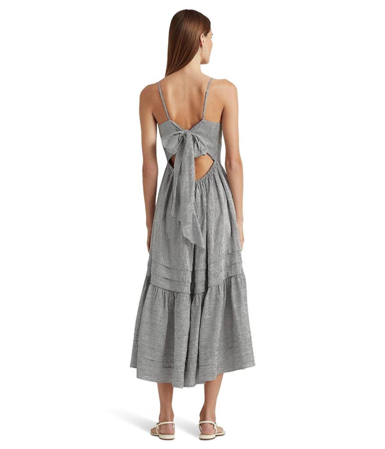 Dress up elegantly and in style wearing LAUREN Ralph Lauren® Striped Bow-Back Linen Dress. Regular fit. Regular fit. Two adjustable sleek straps. Two adjustable sleek straps. Sweetheart neckline. Sweetheart neckline. Voluminous bow-back closure. Voluminous bow-back closure. Pleated tiered skirt. Pleated tiered skirt. Striped pattern. Striped pattern. Intended to hit below the knees. Intended to hit below the knees. 100% linen. 100% linen. Machine washable. Machine washable. Imported. Imported.