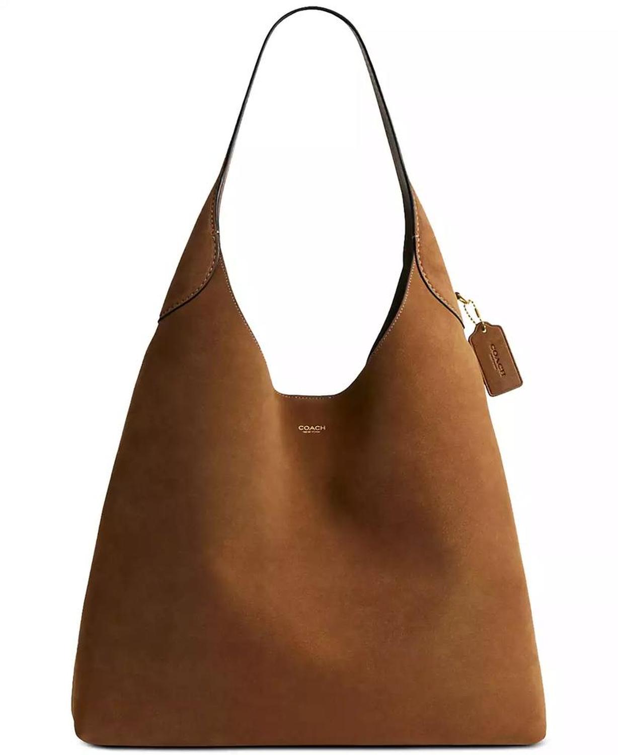 Amply spaced with enough room for your laptop, this suede shoulder bag by COACH has an understated sophistication with iconic details like the luggage tag and foil-printed logo. Extra-large sized bag; 17"W x 15-1/4"H x 4-3/4"D (width is measured across the bottom of handbag); 2.42 lbs. approx. weight Silhouette is based off 5'9" model 12-1/2"L handles Magnetic snap closure Foil-printed logo & luggage tag; interior snap pocket Laptop compatible (std. size 13"-15") Suede, leather Professional leather clean Imported