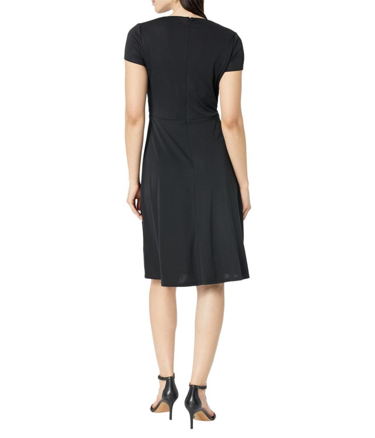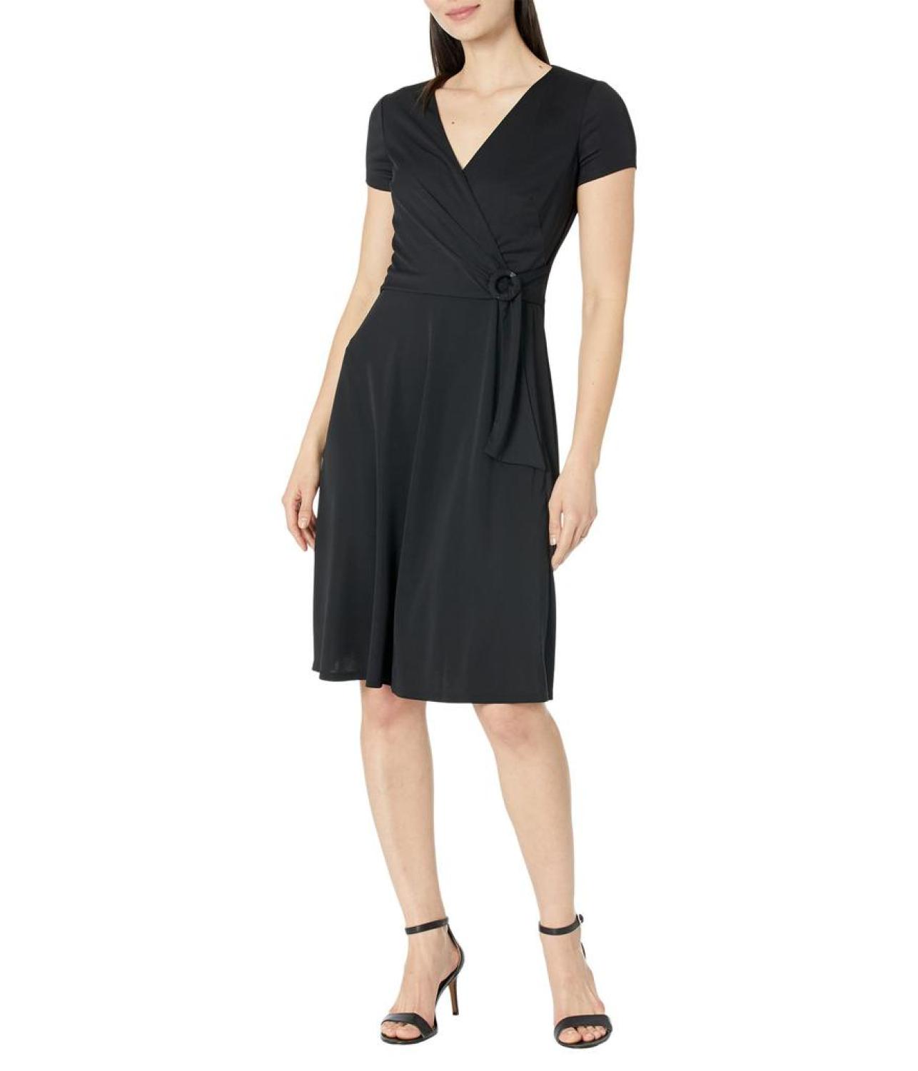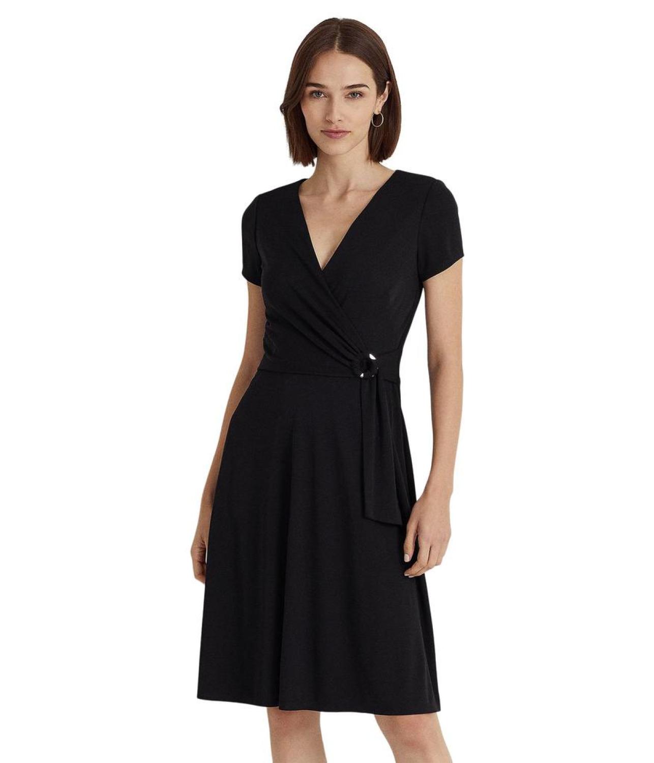 Bring on a graceful touch to your look by donning the beautiful LAUREN Ralph Lauren® Surplice Jersey Dress. Above-the-knee length dress in an A-line silhouette. Surplice V-neckline and short sleeves. Zippered closure on the center back. Circular metallic hardware on the waist with tie detail. Flared skirt. 94% polyester, 6% elastane. Machine washable. Imported. Product measurements were taken using size 0. Please note that measurements may vary by size. Measurements: Length: 40 in Sleeve Length: 7 in