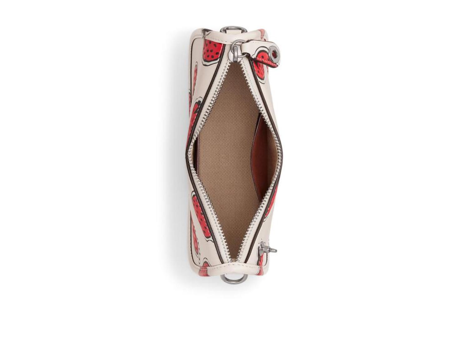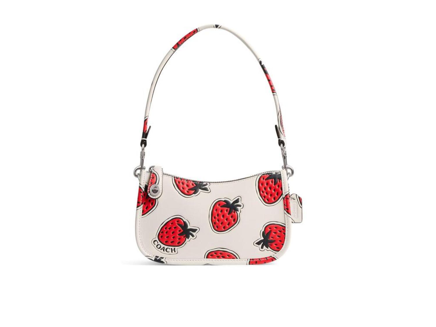 Add the ideal pop of whimsy to any outfit with the COACH™ Swinger 20 with Strawberry Print bag.  The allover strawberry patterning is perfectly paired with the removeable handle.  The zipper closure, interior credit card slots, and single interior pocket add the perfect pop of functionality.