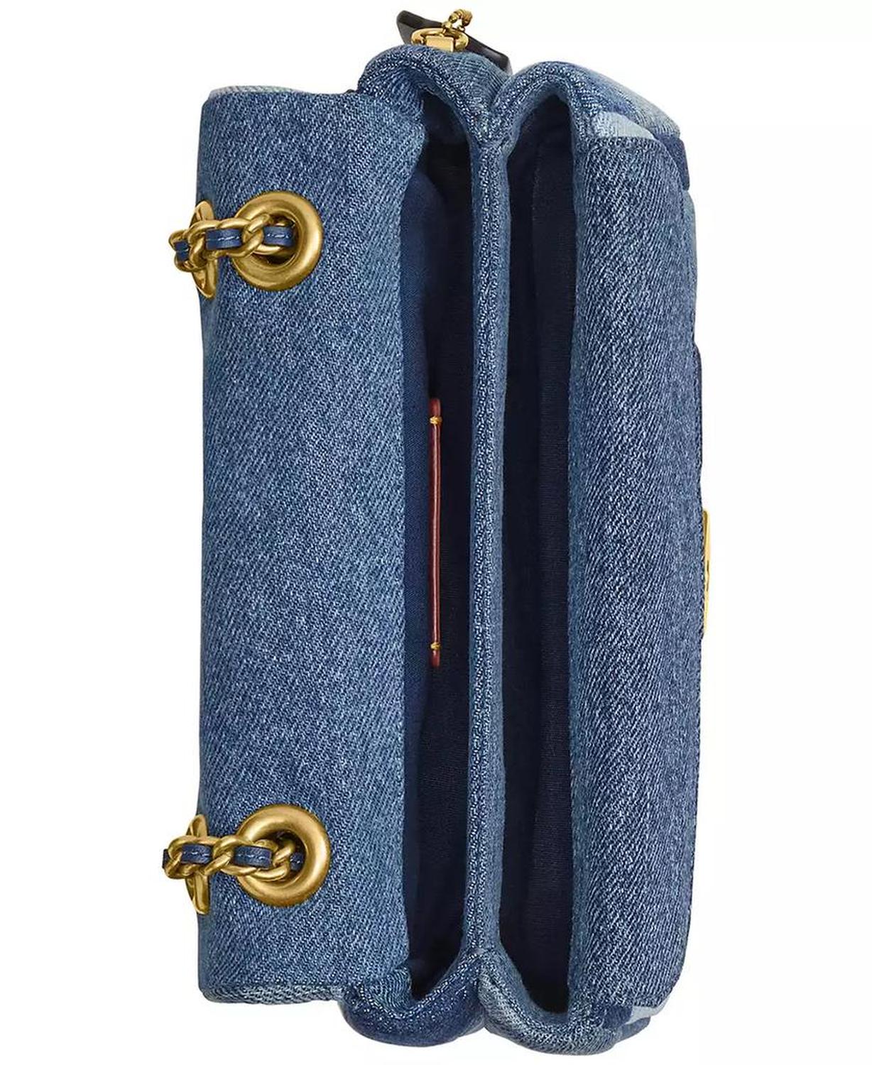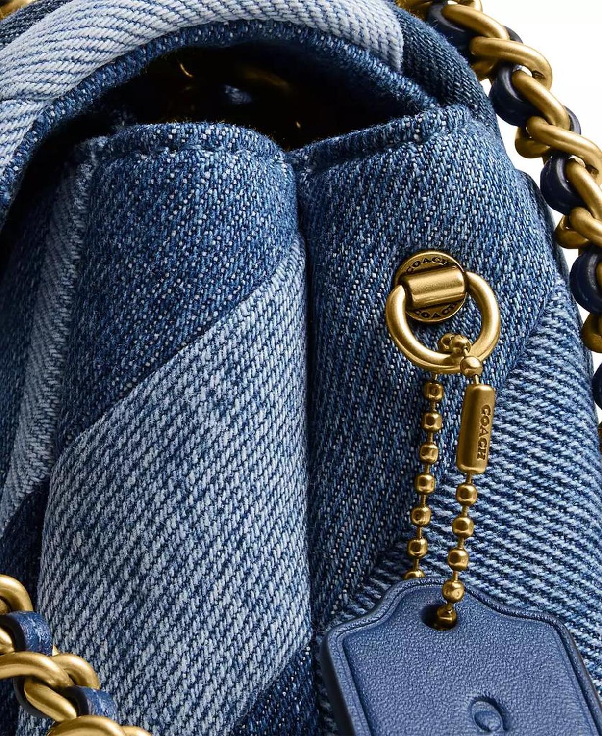Beautifully structured and styled in denim with leather accents, this COACH shoulder bag features a chic chain strap. Mini-sized bag; 7-3/4"W x 4-1/4"H x 2-3/4"D (width is measured across the bottom of handbag); 1.02 lbs. approx. weight Silhouette is based off 5'9" model 21-1/2" L chain strap Push-lock closure Brass-tone exterior hardware & logo, back slip pocket; interior double compartment 100% cotton; trim: leather Spot clean Imported