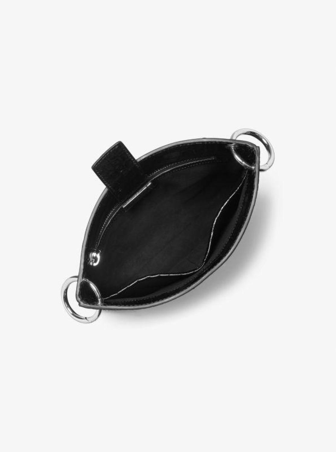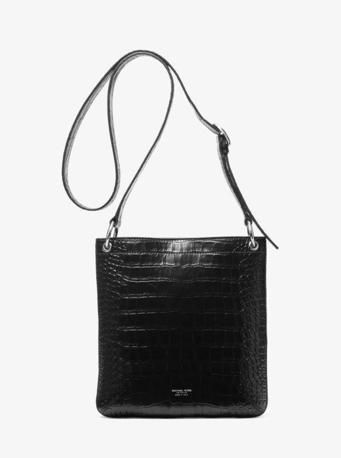 • A slim, chic take on the timeless tote, the Tate draws inspiration from the barefoot glamour of luxe vacation destinations like Capri. This messenger bag is finely crafted in Italy from crocodile-embossed patent leather and features a soft suede lining. An adjustable crossbody strap accented by two polished rings completes the effect.