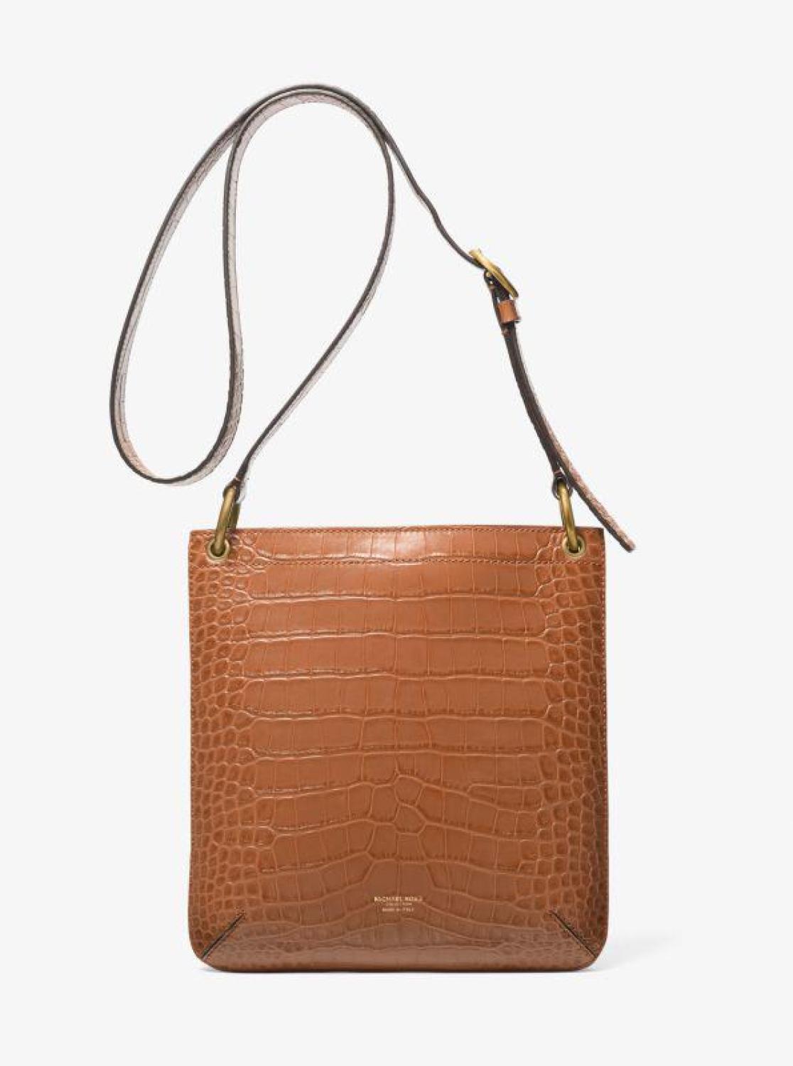 • A slim, chic take on the timeless tote, the Tate draws inspiration from the barefoot glamour of luxe vacation destinations like Capri. This messenger bag is finely crafted in Italy from crocodile-embossed patent leather and features a soft suede lining. An adjustable crossbody strap accented by two polished rings completes the effect.
