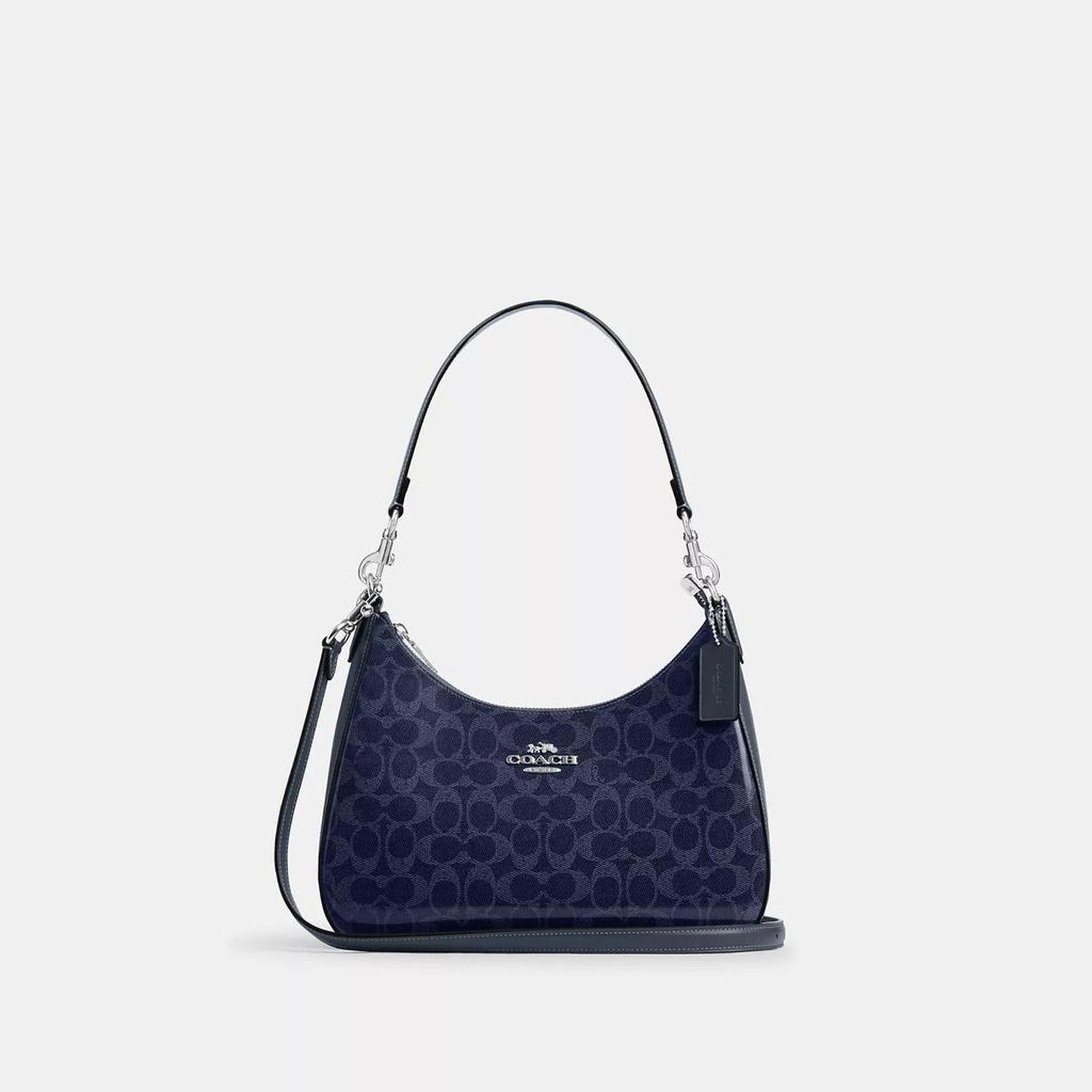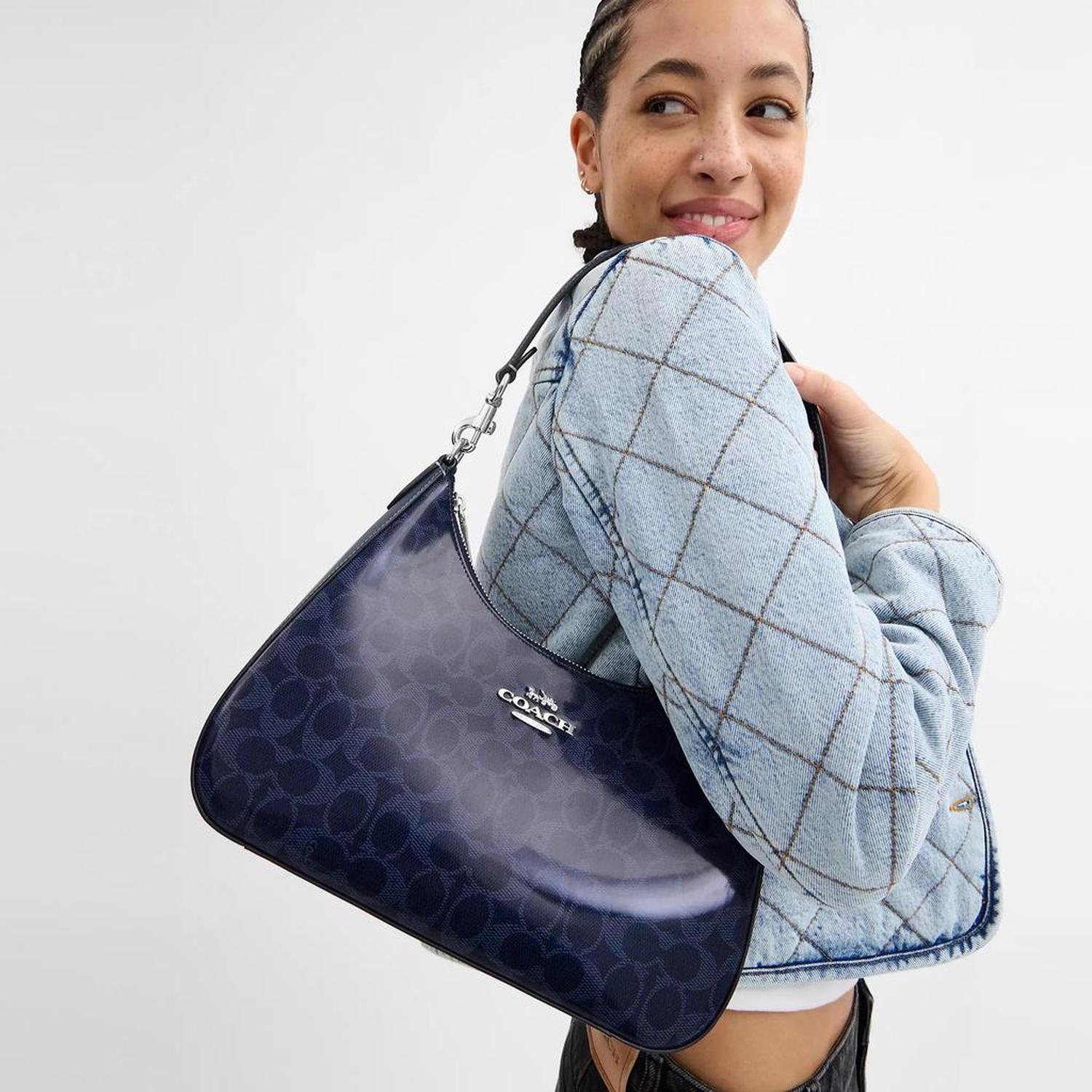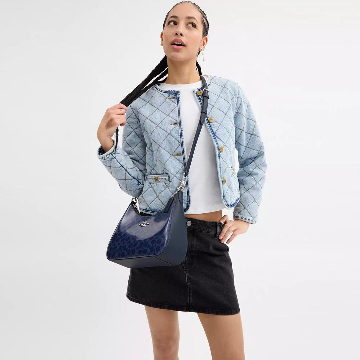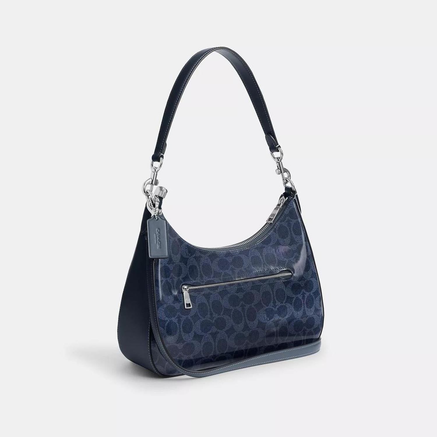Signature coated canvas Inside zip and multifunction pockets Zip-top closure fabric lining Detachable handle with 11 drop Outside zip pocket Detachable strap with 22 drop for shoulder or crossbody wear 11 1/2 (L) x 9 1/4 (H) x 3 1/2 (W) Style No. CAK28 | Coach Outlet Teri Hobo Bag In Signature Canvas - Blue