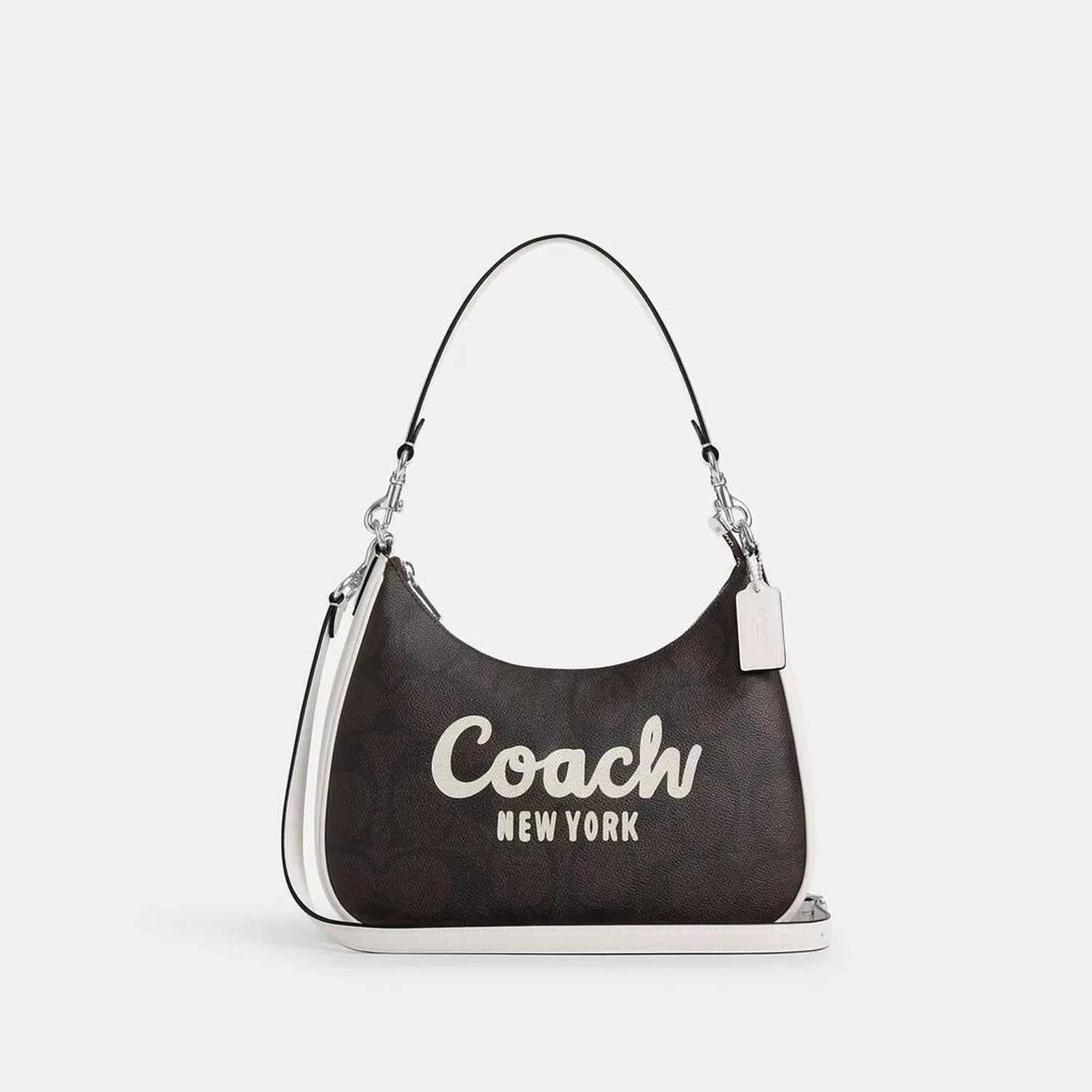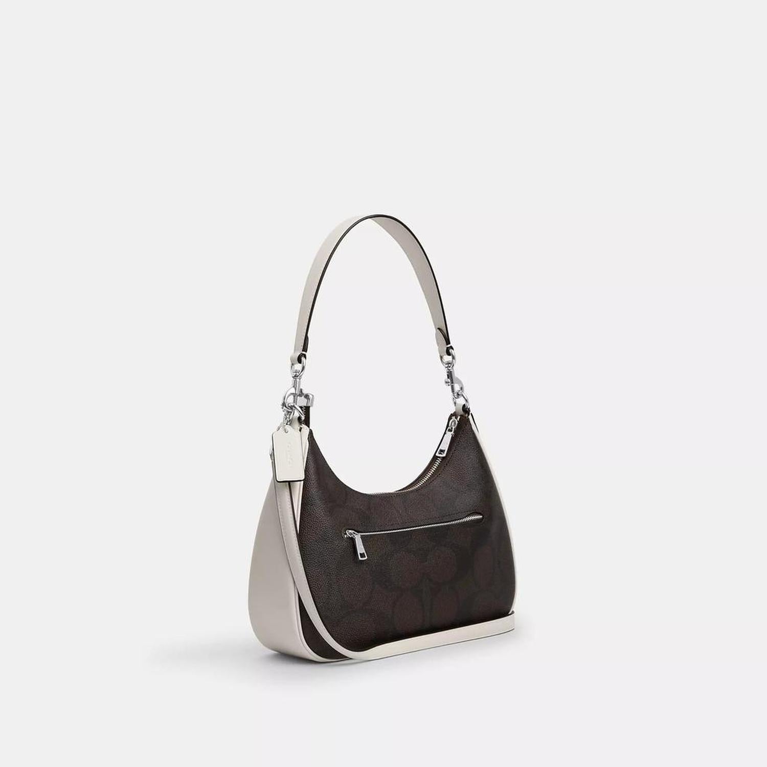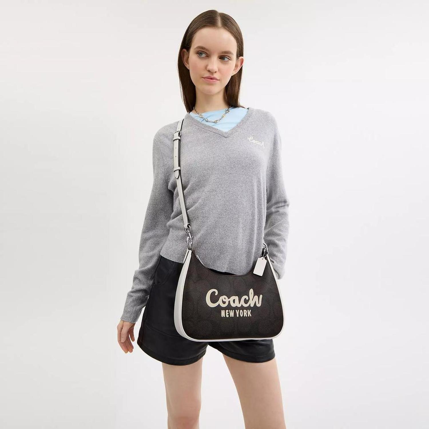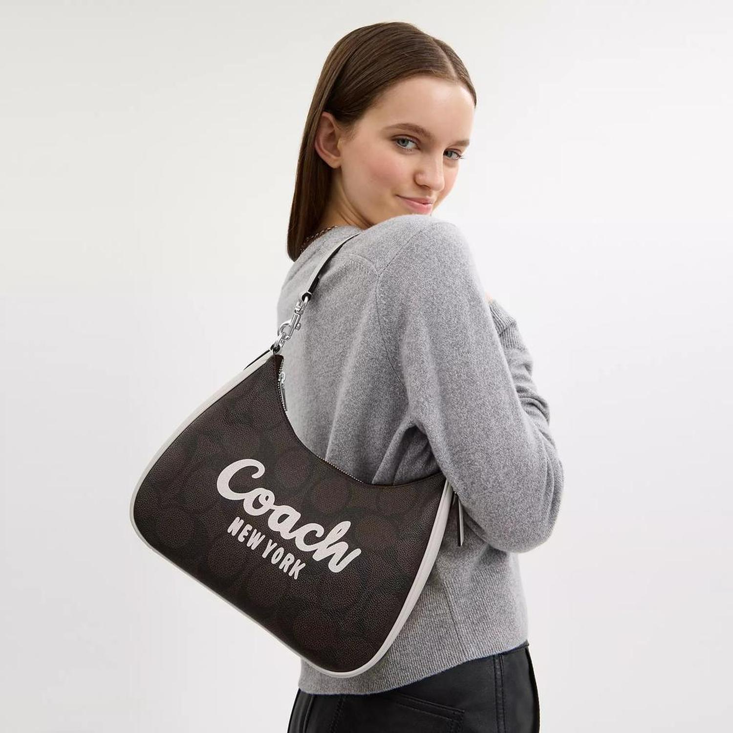 Signature coated canvas Inside zip and multifunction pockets Zip-top closure fabric lining Detachable handle with 11 drop Outside zip pocket Detachable strap with 22 drop for shoulder or crossbody wear 11 1/2 (L) x 9 1/4 (H) x 3 1/2 (W) Style No. CAG21 | Coach Outlet Teri Hobo In Signature Canvas With Coach Graphic - Multi