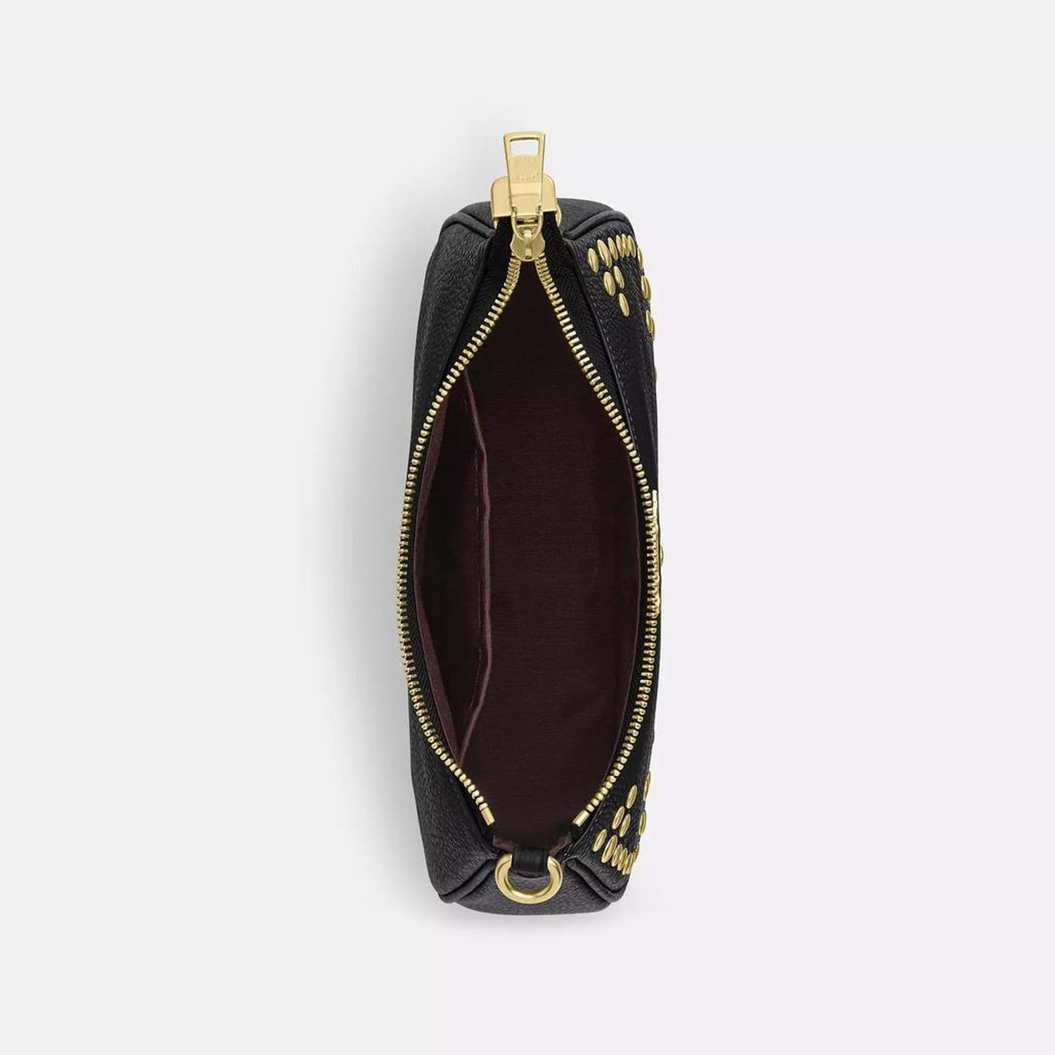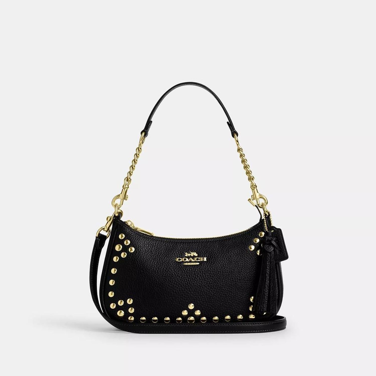 Refined pebble leather Inside multifunction pocket Zip-top closure fabric lining Detachable handle with 8 1/2 drop Detachable strap with 22 3/4 drop for shoulder or crossbody wear 9 1/2 (L) x 6 (H) x 3 (W) Style No. CAK03 | Coach Outlet Teri Shoulder Bag With Rivets - Black