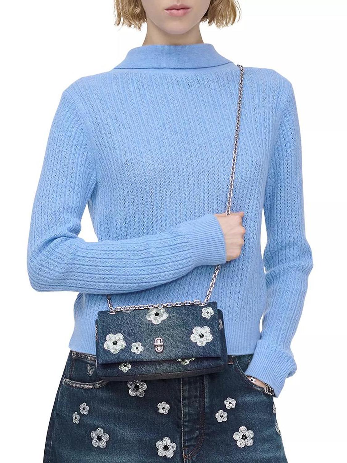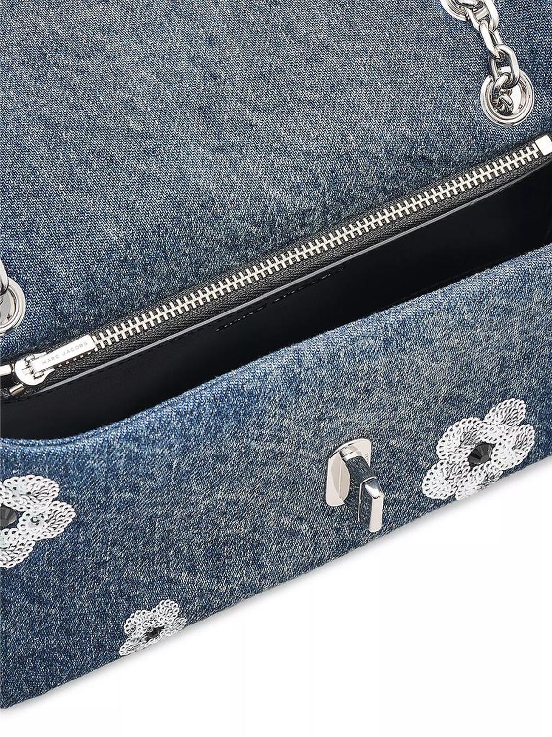 This Marc Jacobs shoulder bag makes a statement with sequined flowers adorning a denim fabric, adding a touch of texture. A pull-through chain shoulder strap complements the design, while a turn-lock closure opens to reveal a well-organized interior equipped with four card slots and a zip pocket.Shoulder strapInterior: one zip pocket and four card slotsFlap with turn-lock closureDust bagCottonLining: Textile/cottonImportedSIZEAbout 8.2"W x 4.3"H x 2.7"DShoulder strap: about 11.8" drop