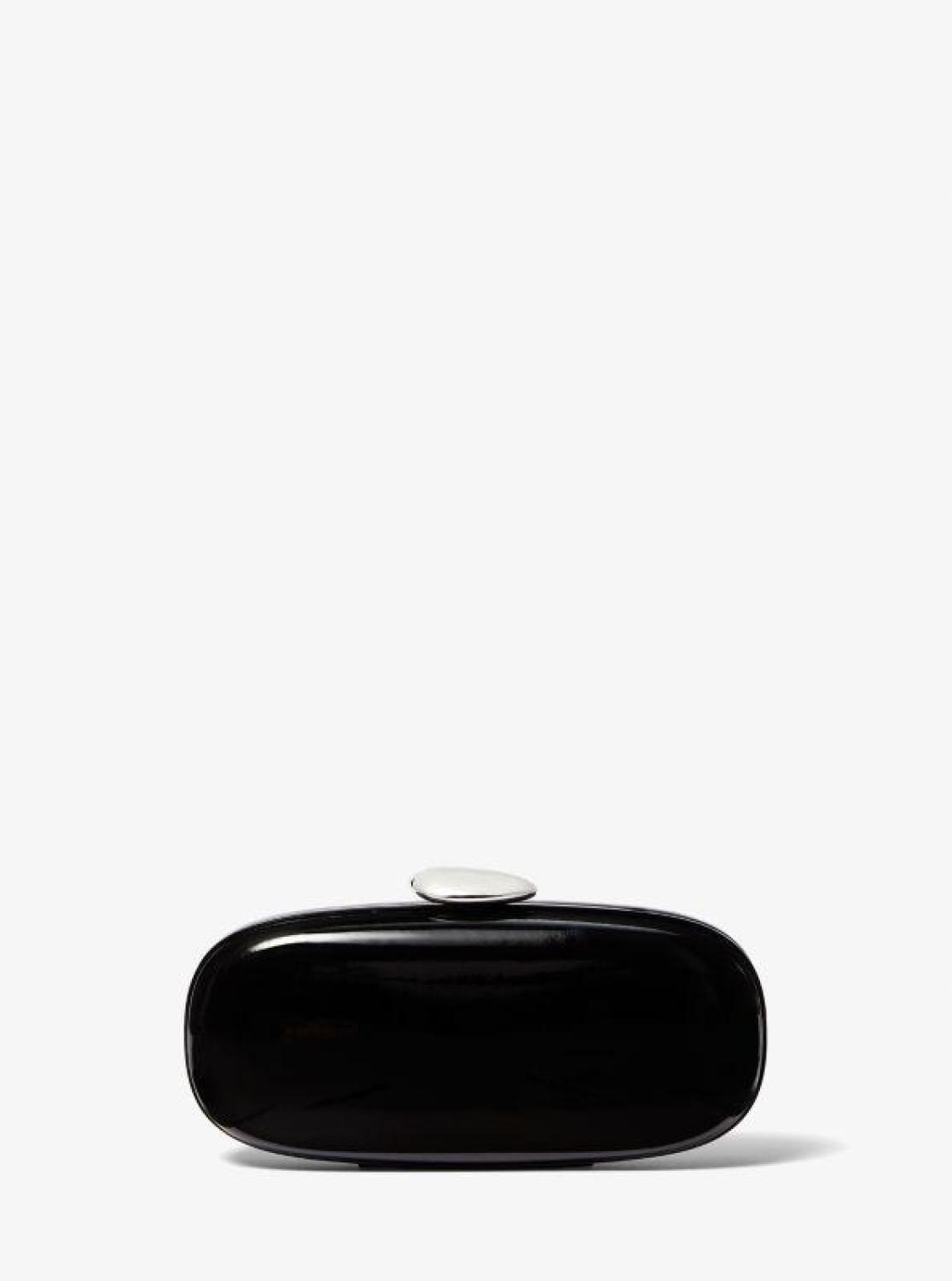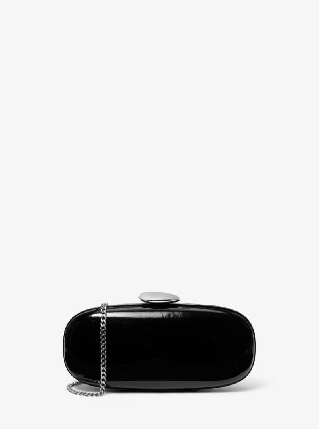 • Featuring a sculptural stone-shaped top closure, our modern Tina minaudière is defined by sleek lines and a removable chain strap. Crafted from high-shine Italian patent leather—and equipped with a rich, suede-lined interior—it perfectly complements breezy dresses and tailored suiting alike.