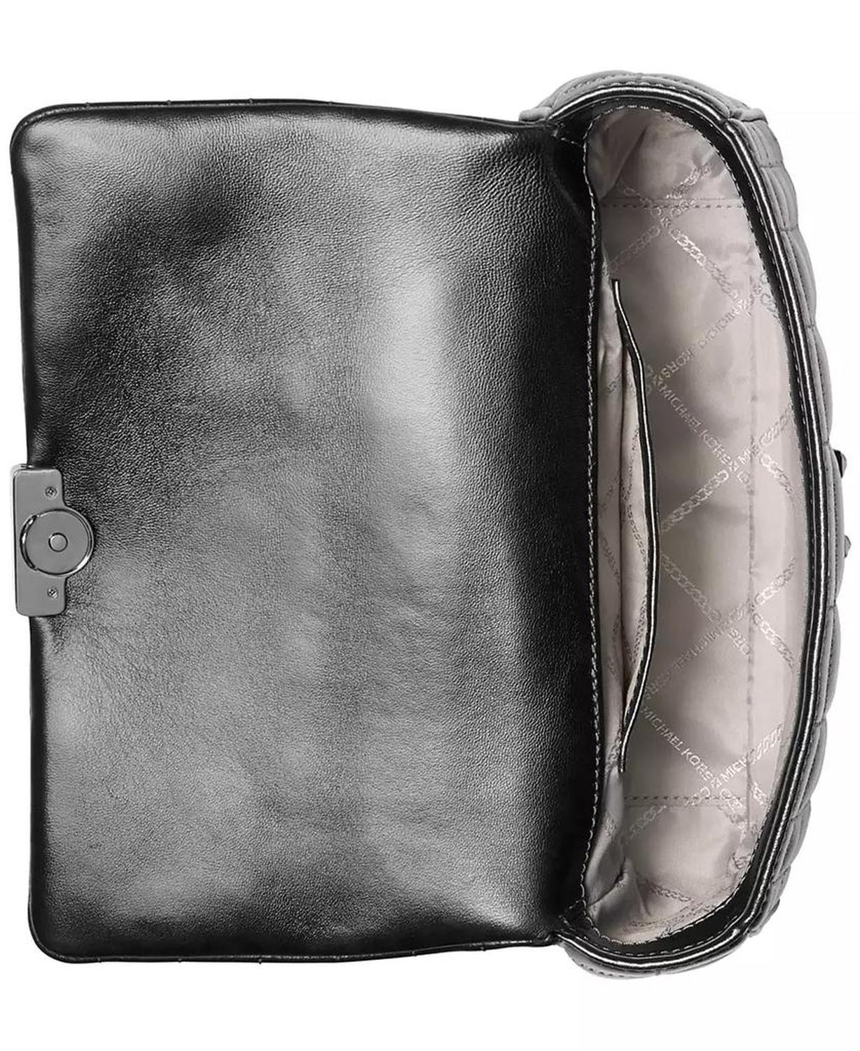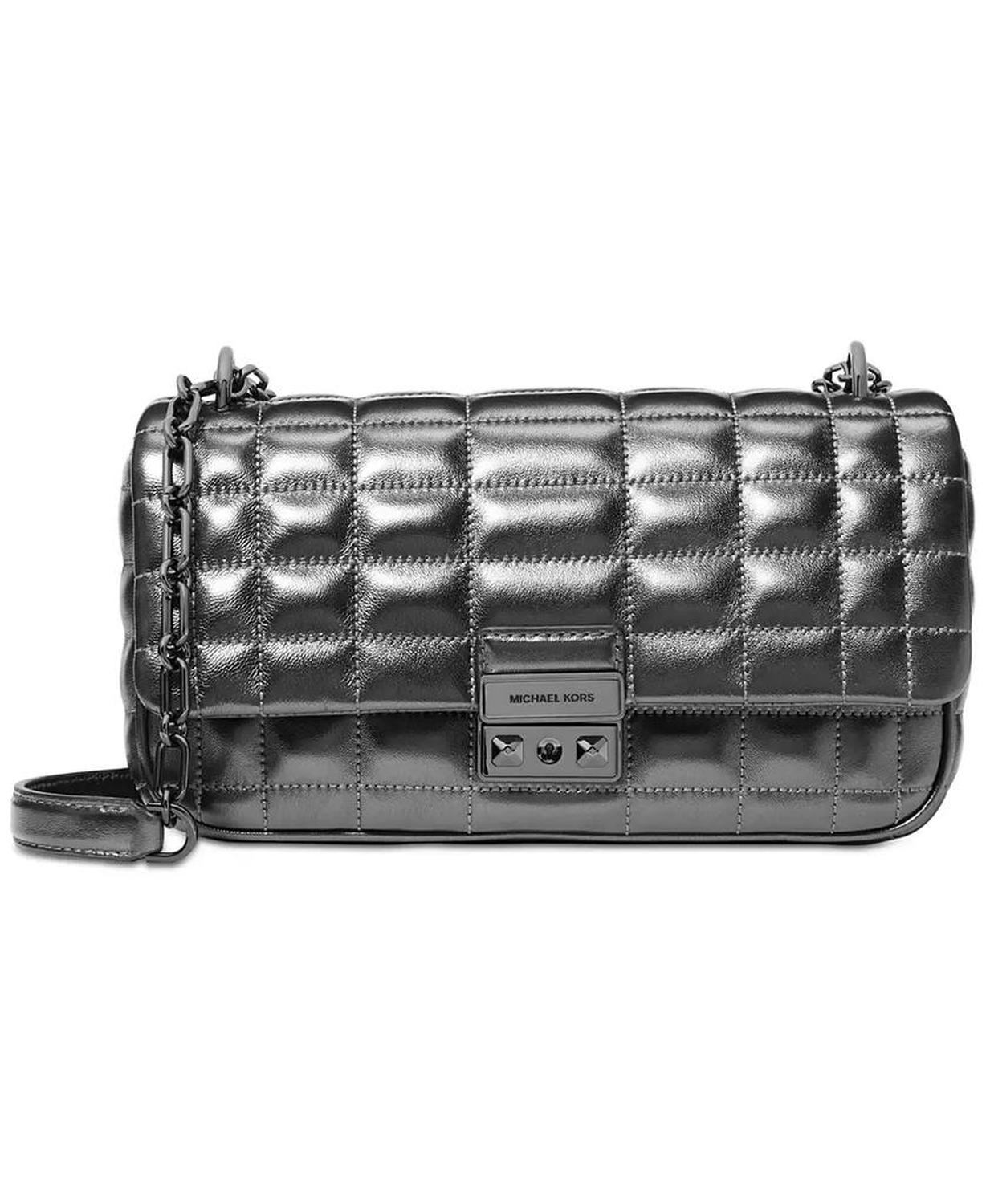 Quilted leather is accented with a bold logo plaque, defining this accessory by MICHAEL Michael Kors that can be worn as a shoulder bag or crossbody with the convertible strap. Small sized bag; 10"W x 5-1/2"H x 3"D (width is measured across the bottom of handbag) Silhouette is based off 5'9" model 11-1/2"L - 20-1/2"L convertible chain strap Magnetic closure Hardware tone varies by color, metal logo plaque; interior slip pocket Leather; lining: polyester Spot clean Imported