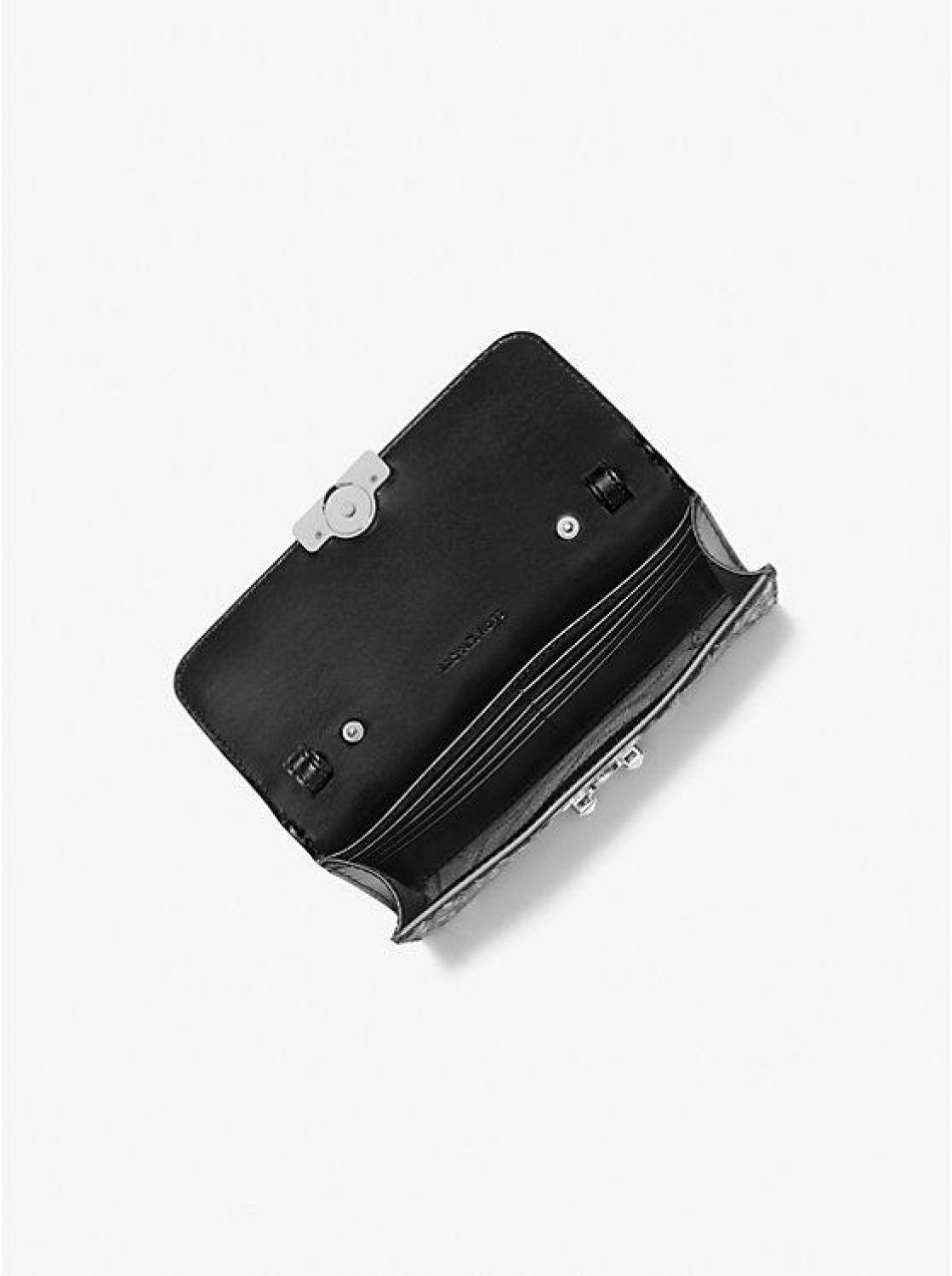 • Our newest addition to the Tribeca family is equally sleek and eye-catching. Made from leopard-print calf hair, it’s designed in a slim profile and features a detachable chain-link strap for added styling options. The pocketed interior will safely hold a card case, lipstick and keys.