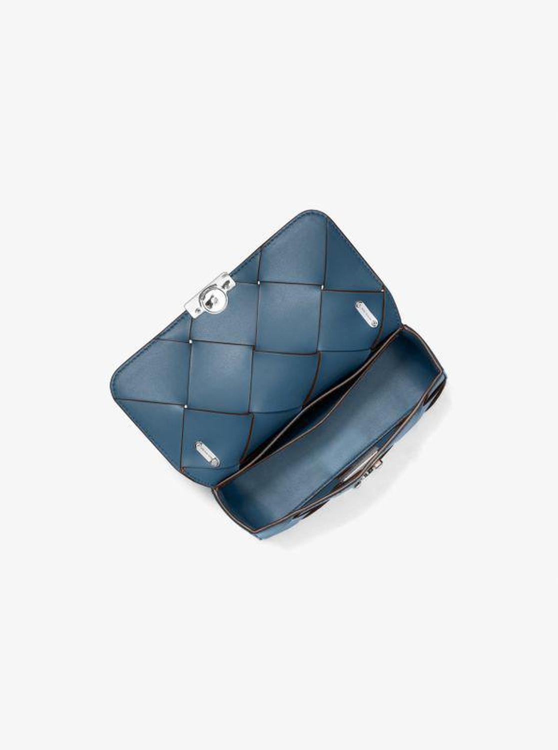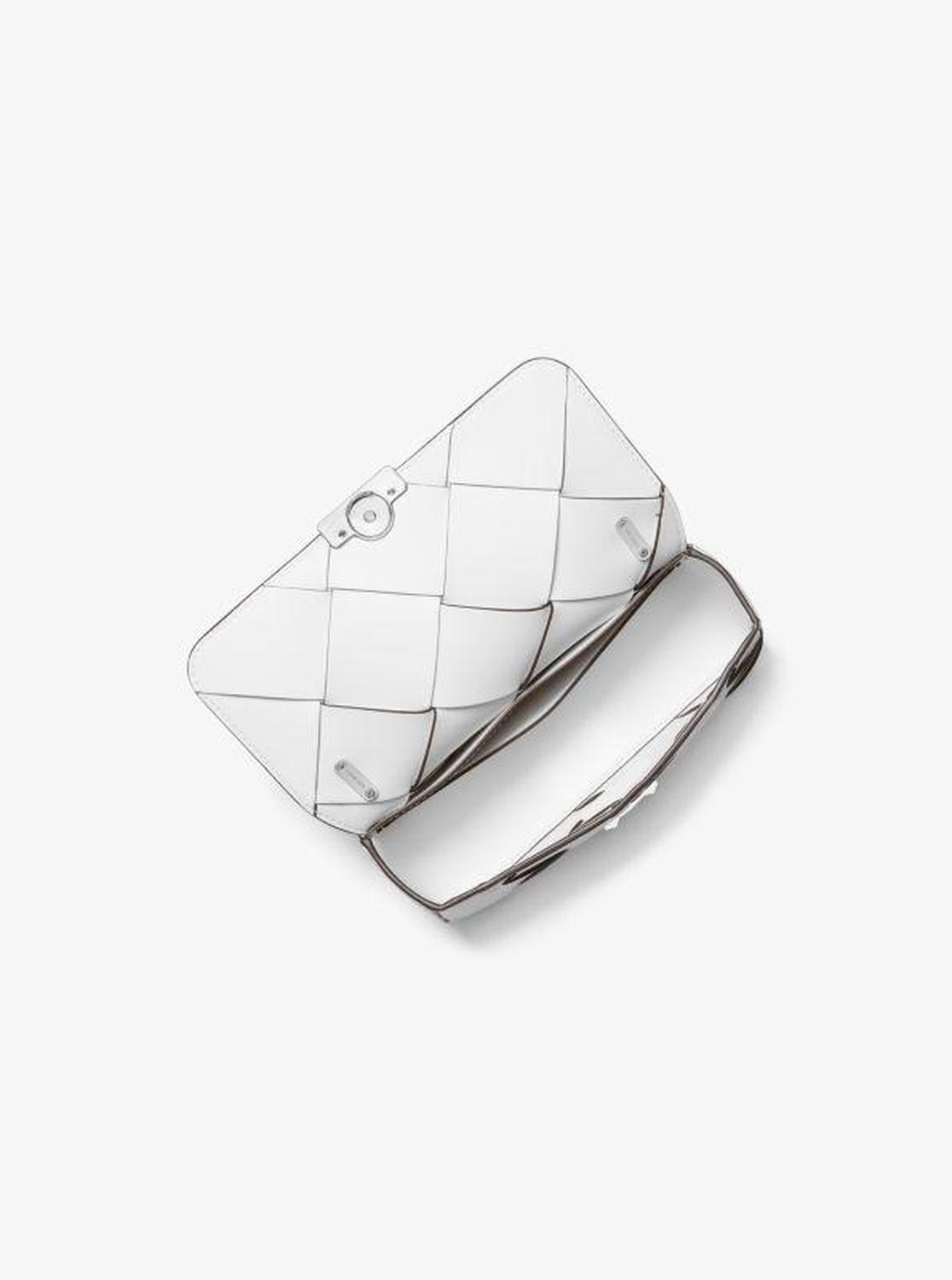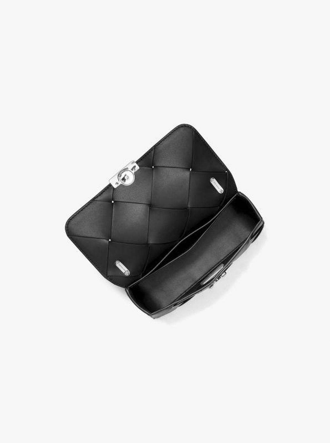 • Rendered in woven leather with chain-link hardware, our Tribeca shoulder bag is the definition of downtown chic. The lined interior is perfectly sized to fit your phone and wallet, while the convertible design renders it endlessly portable. Carry it day or night.