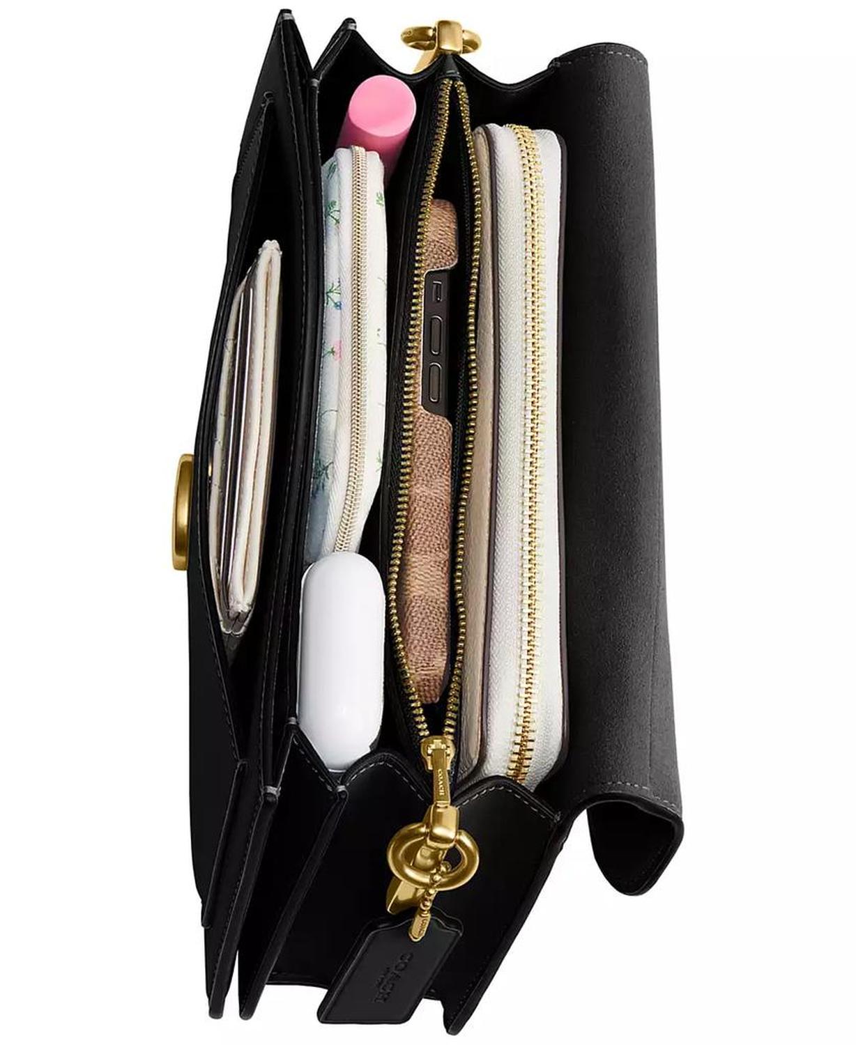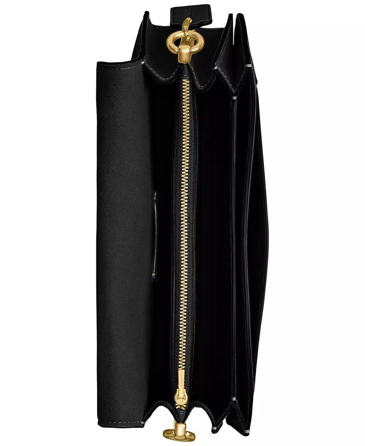 Brass-tone hardware & logo, exterior back slip pocket, interior zip & multifunction pockets