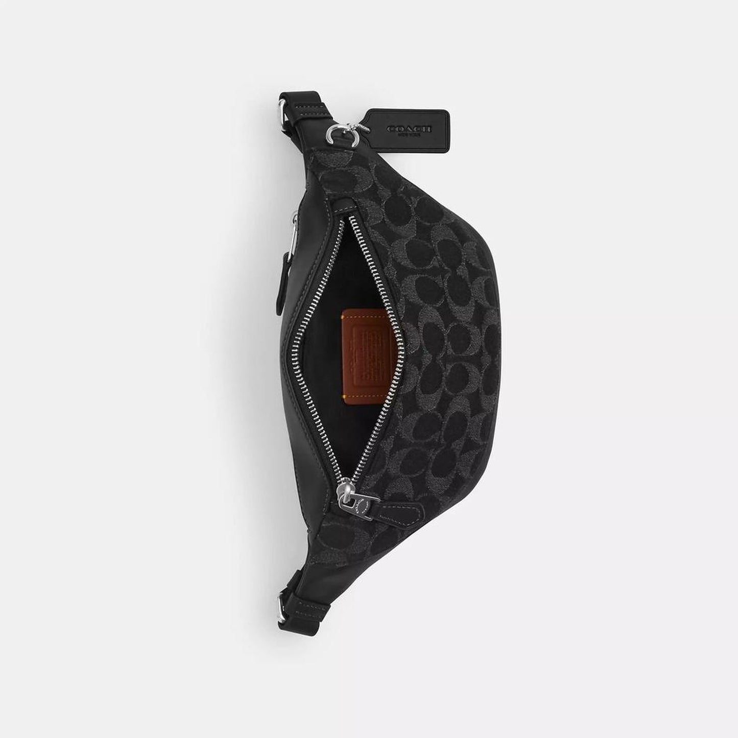 • Signature denim and smooth calf leather Zip closure fabric lining Outside zip pocket Adjustable strap with 49 length for wear at waist 11 1/2 (L) x 4 3/4 (H) x 2 (W) Exclusive of trim this denim style is crafted of cotton sourced from farms that use regenerative agricultural practices—those that help to maintain and rejuvenate land increase biological diversity and soil health and could lead to increased carbon absorption Style No. CAJ43 | Coach Outlet Warren Mini Belt Bag In Signature Denim - Black