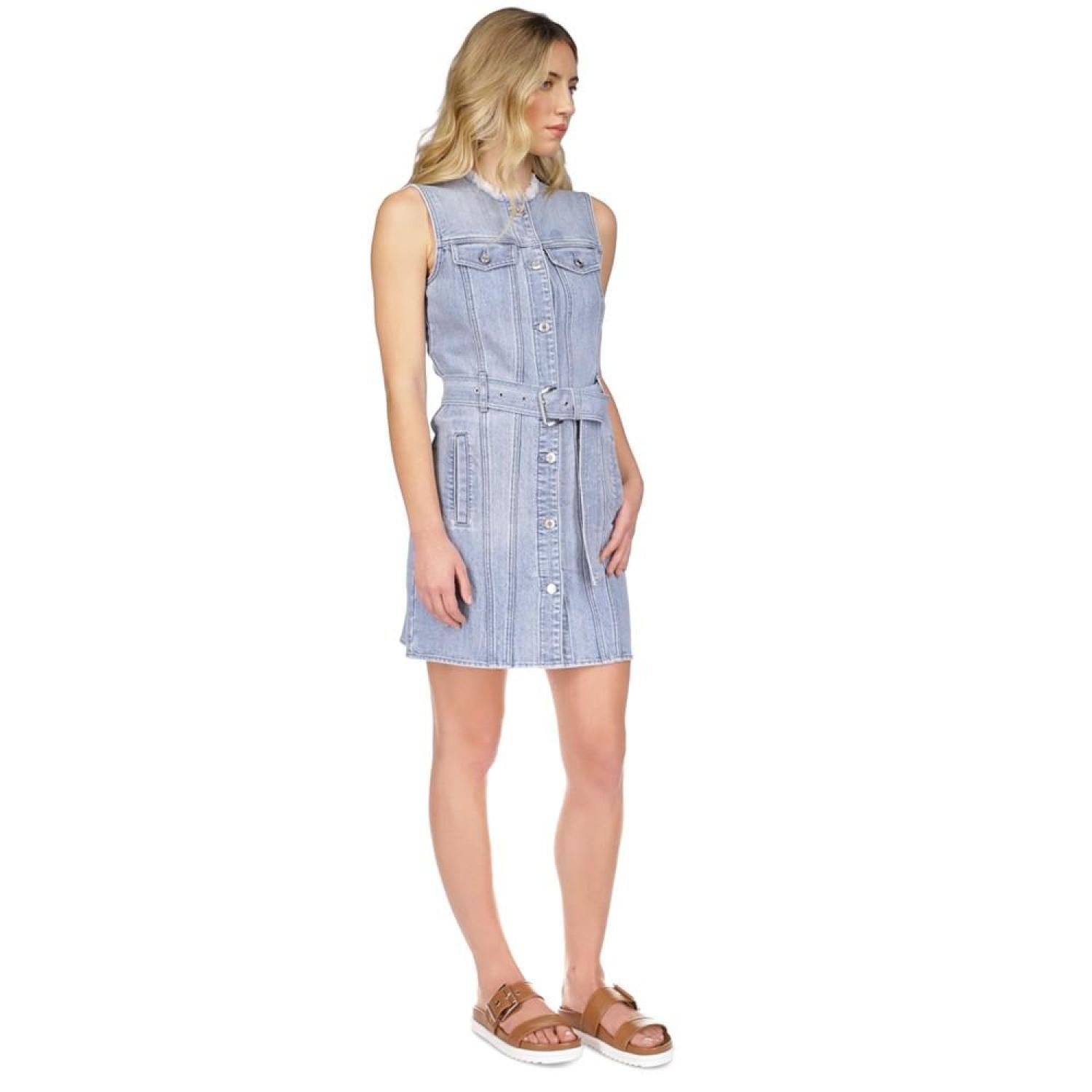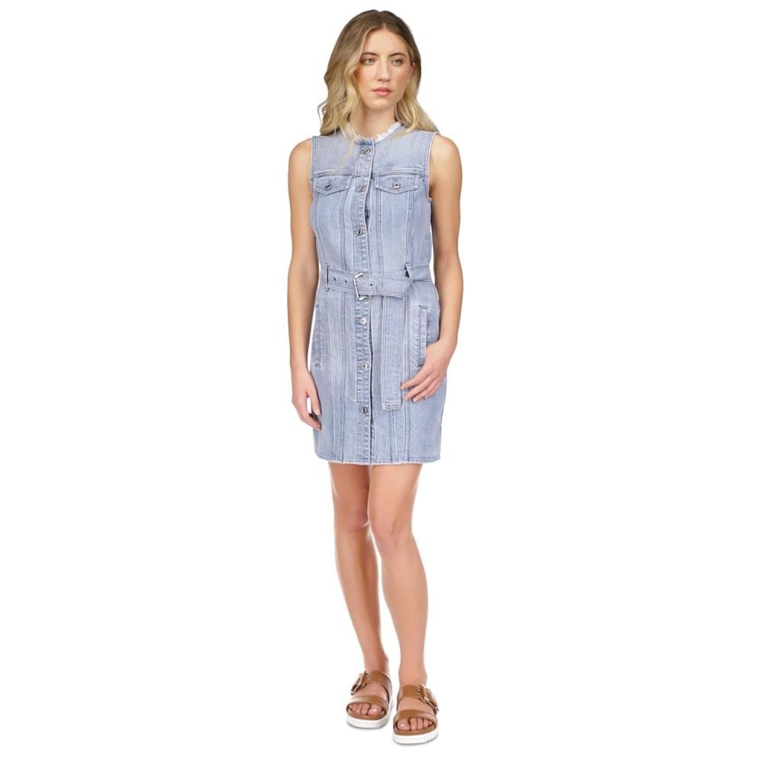 Frayed at the neckline for a fresh edge, this MICHAEL Michael Kors dress puts a short-and-sweet spin on the denim shirtdress. Approx. 35-1/2" long from center back neck to hem Front-button closure Frayed crewneck; Shirtdress silhouette Buttons at front Sleeveless Self D-ring belt Allover fading XS=0-2, S=2-4, M=6-8, L=10-12, XL=14-16 Unlined Cotton, polyester, elastane Machine wash Imported
