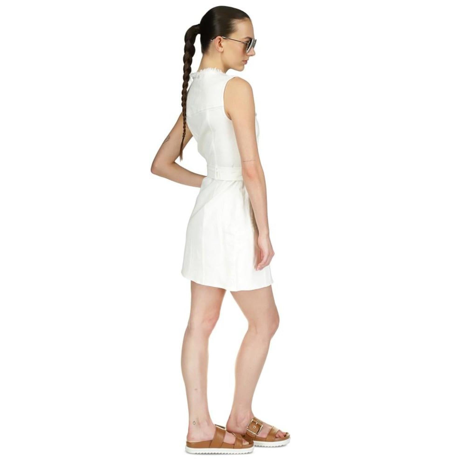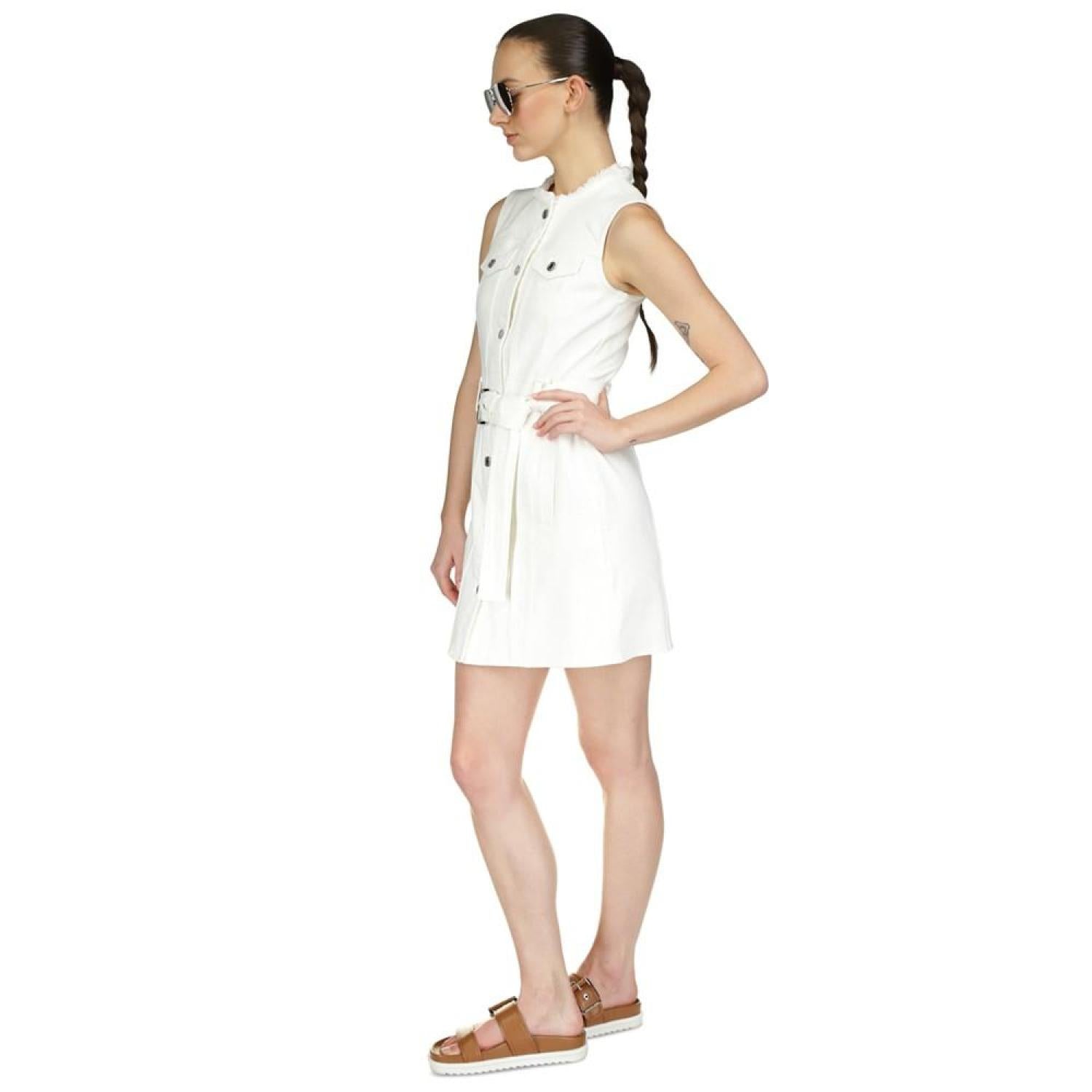 Crisp in a white wash, this MICHAEL Michael Kors dress is in cotton-blend denim for a comfy feel. The sleeveless shirtdress is sleek in a fitted silhouette that gets an edge from a frayed neckline. Approx. 35-1/2" long from center back neck to hem Front-button closure Frayed crewneck; Shirtdress silhouette Front buttons Sleeveless Self D-ring belt XS=0-2, S=2-4, M=6-8, L=10-12, XL=14-16 Unlined Cotton, elastane Machine wash Imported