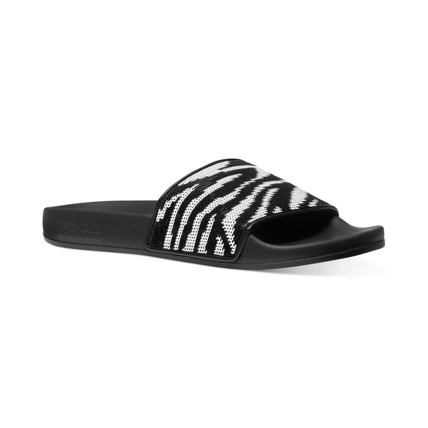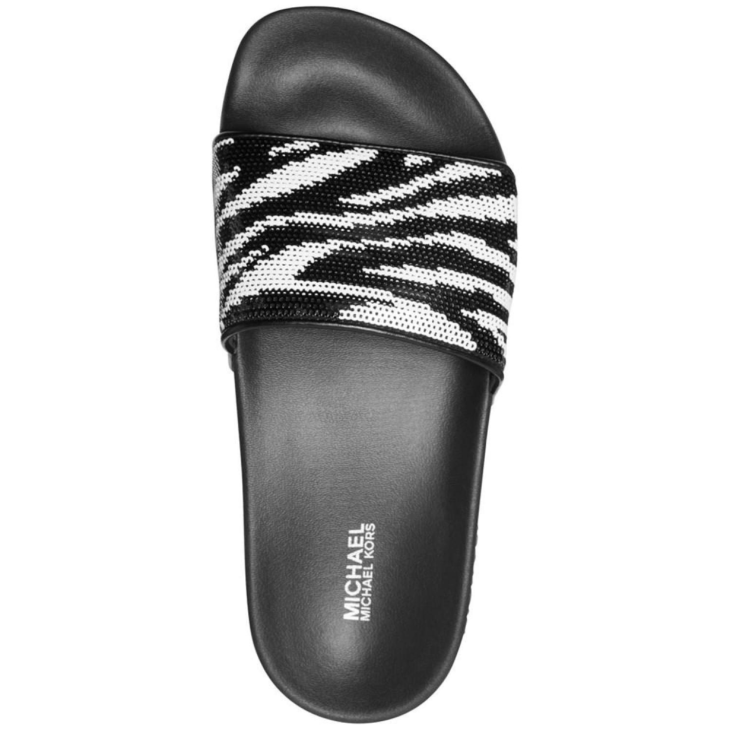 Simple MICHAEL Michael Kors slides are made a bit extra with the addition of stylish zebra sequins. Round open Slip on Manmade upper, lining and sole Imported