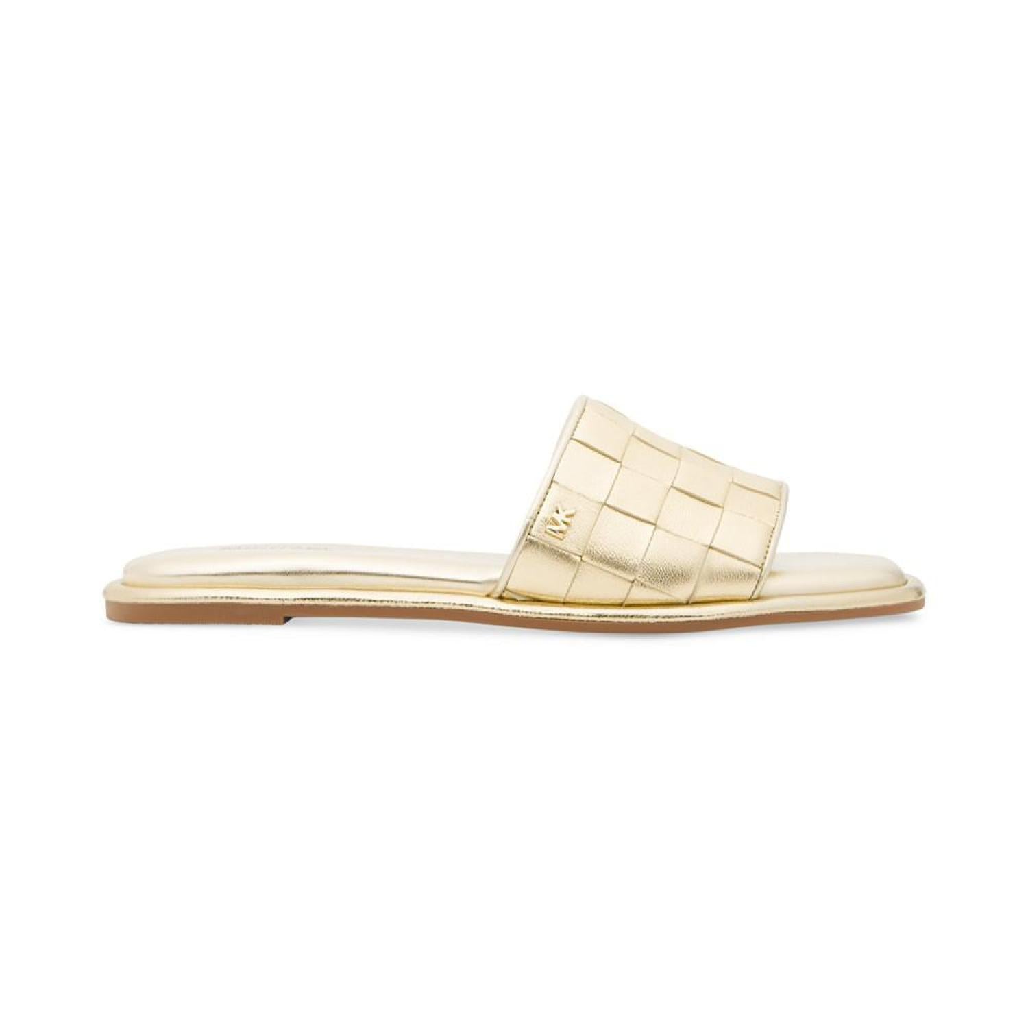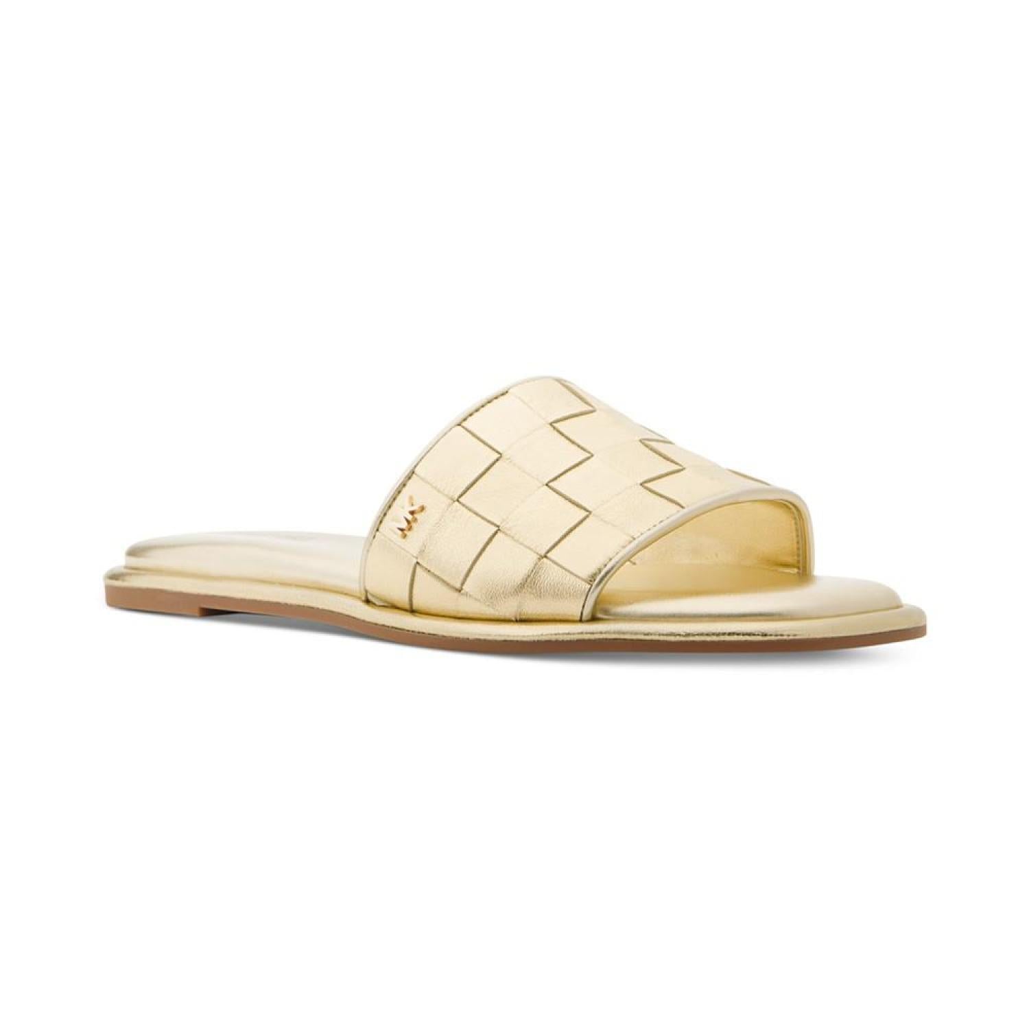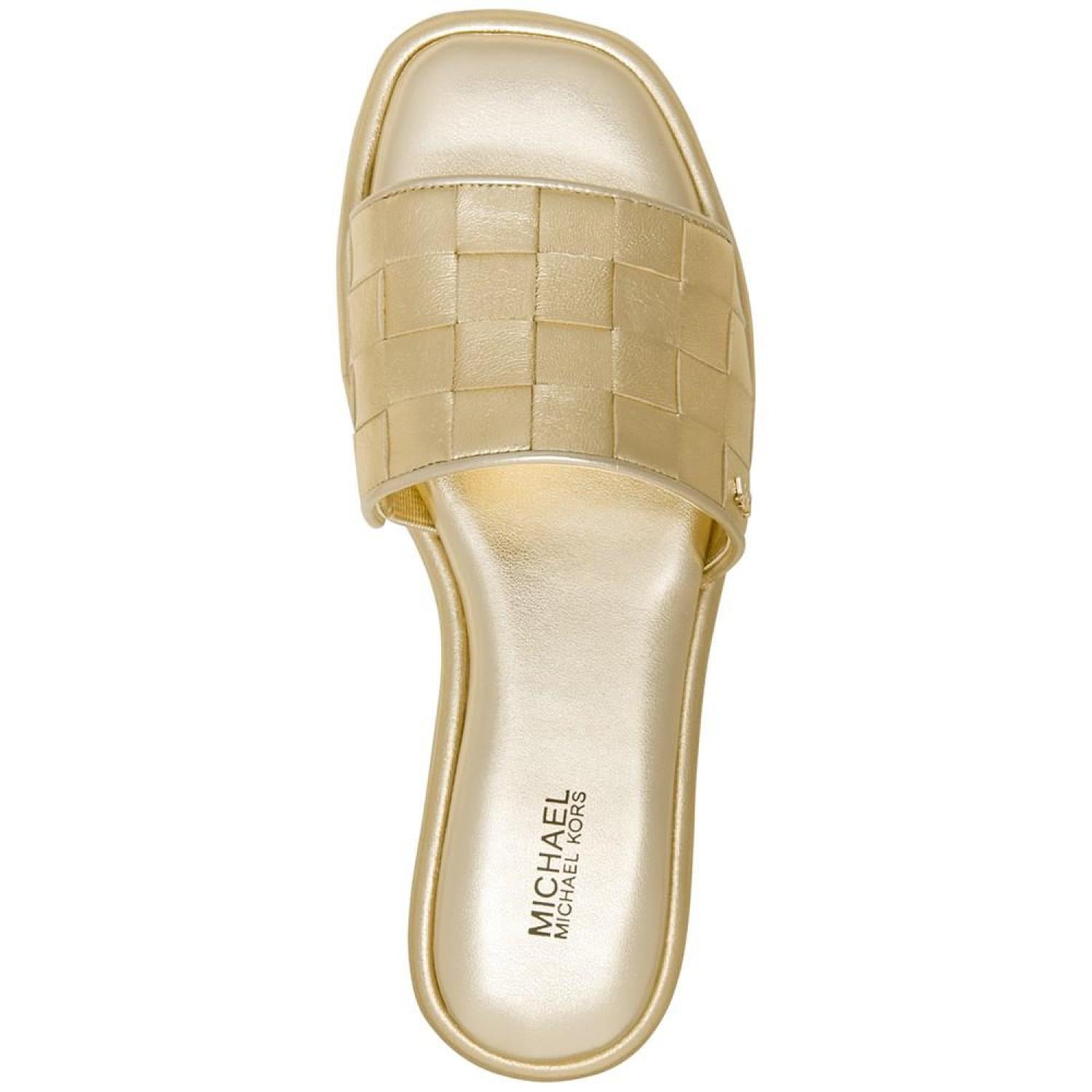 Wide woven straps slip-on in effortless fashion and signature style with the versatile Hayworth slides from MICHAEL Michael Kors.