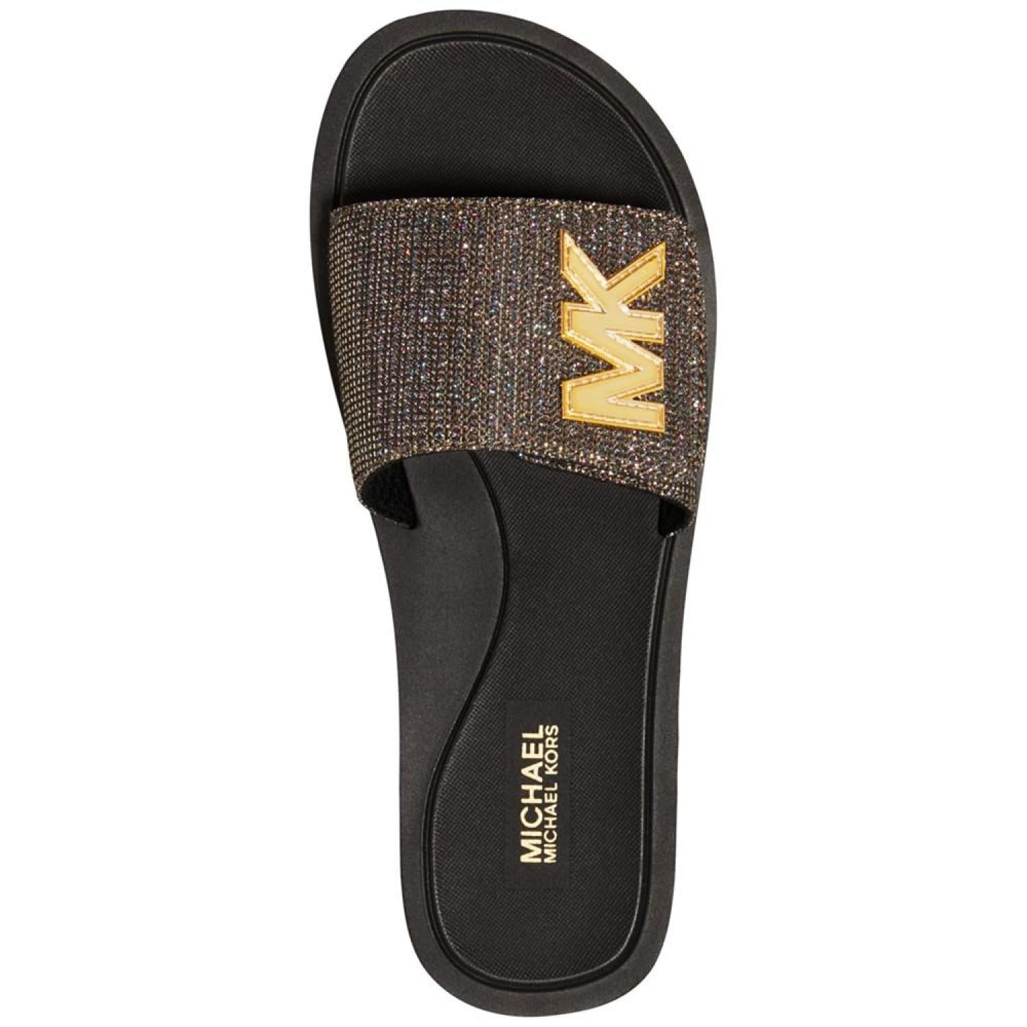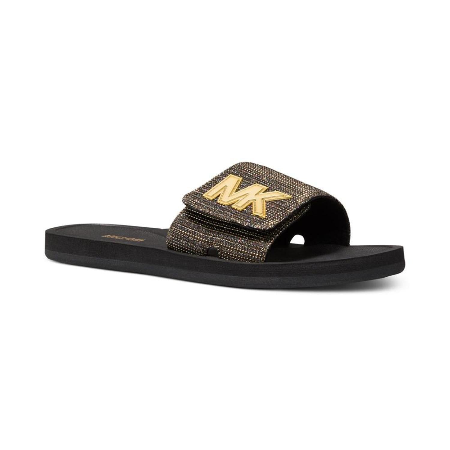 Combining glittering chain mesh with a minimalist silhouette, this pair is a fresh take on the of-the-moment slide style. Wear them with sporty separates for an effortless off-duty look. Round-toe slip-on slide sandals with adjustable hook and loop strap Logo hardware at strap Fabric upper; rubber sole Wipe clean Imported