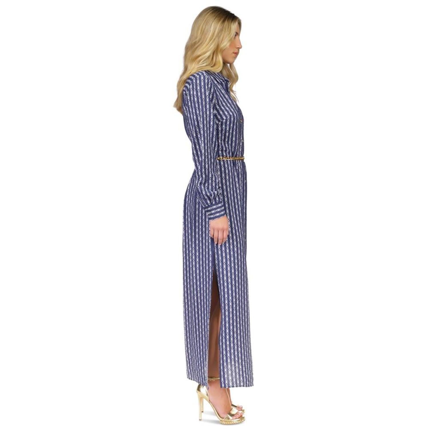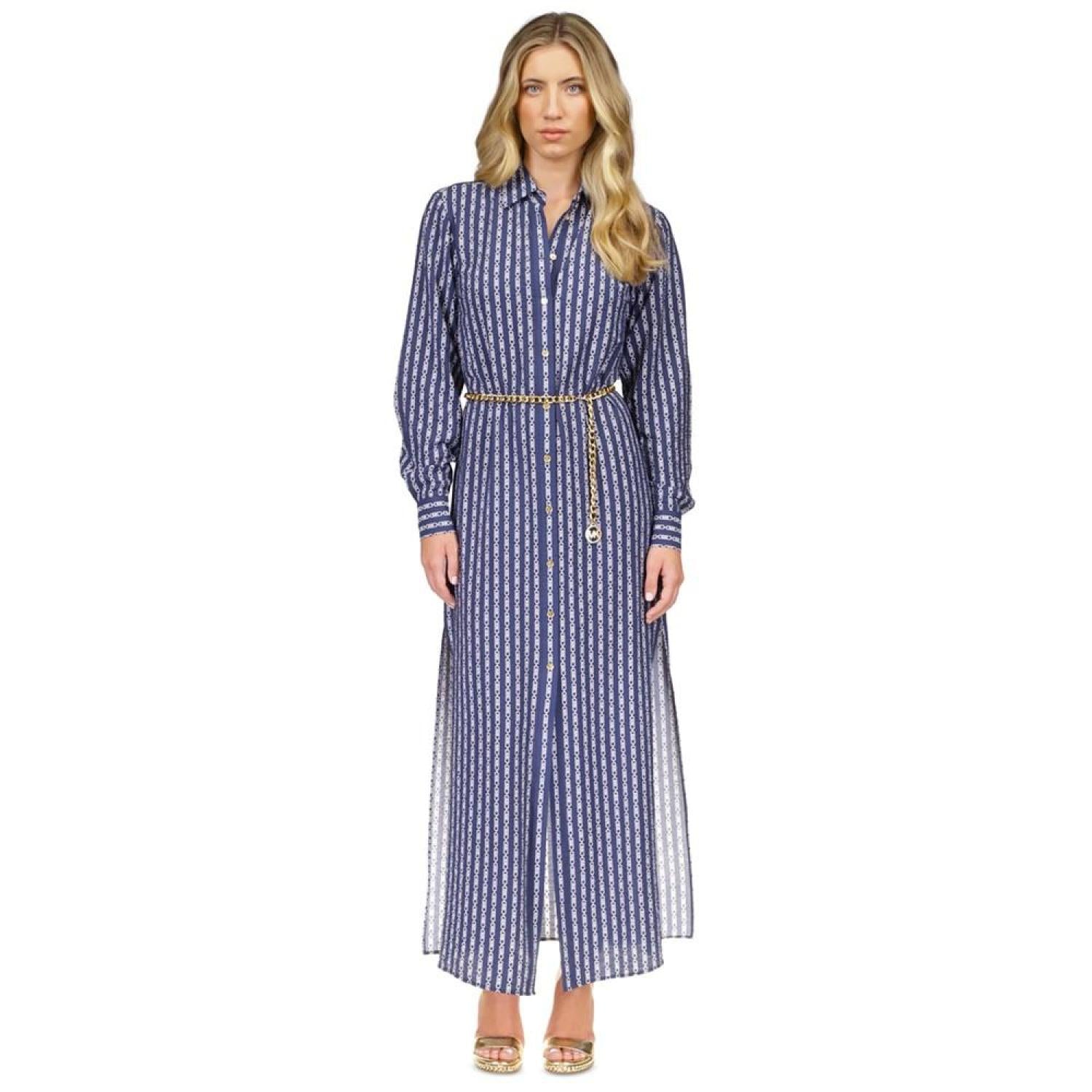 Unlock a chic look with this belted shirtdress from MICHAEL Michael Kors. Approx. 57" long at front from high point of shoulder Button-front dress Point collar; Shirtdress silhouette Front button closures Long sleeves Chain belt at waist; slits at sides Unlined Viscose, nylon Dry clean Imported