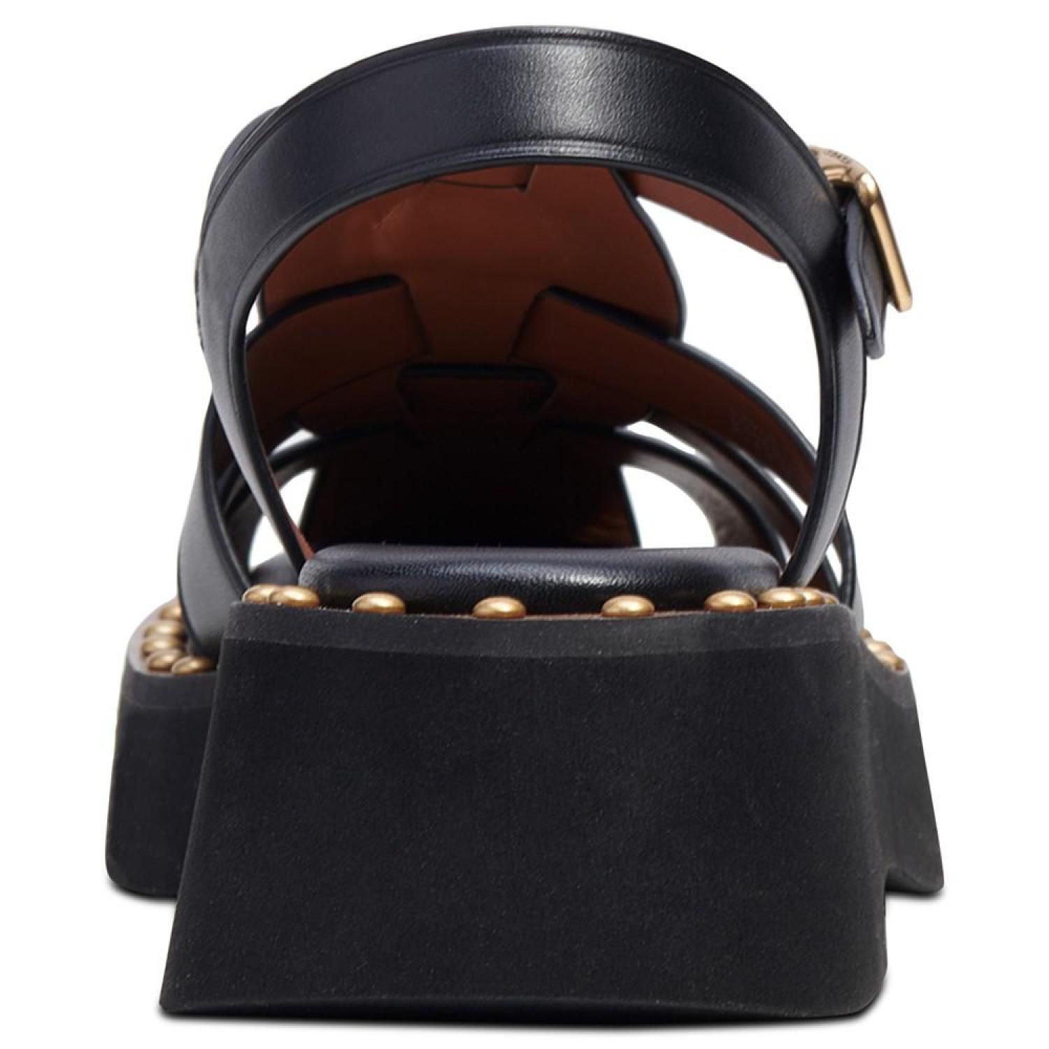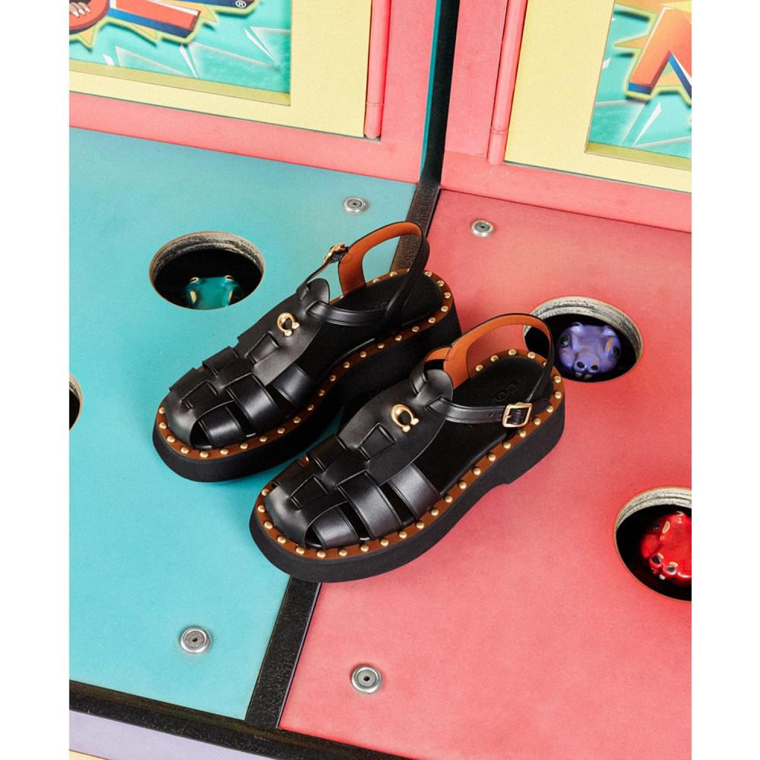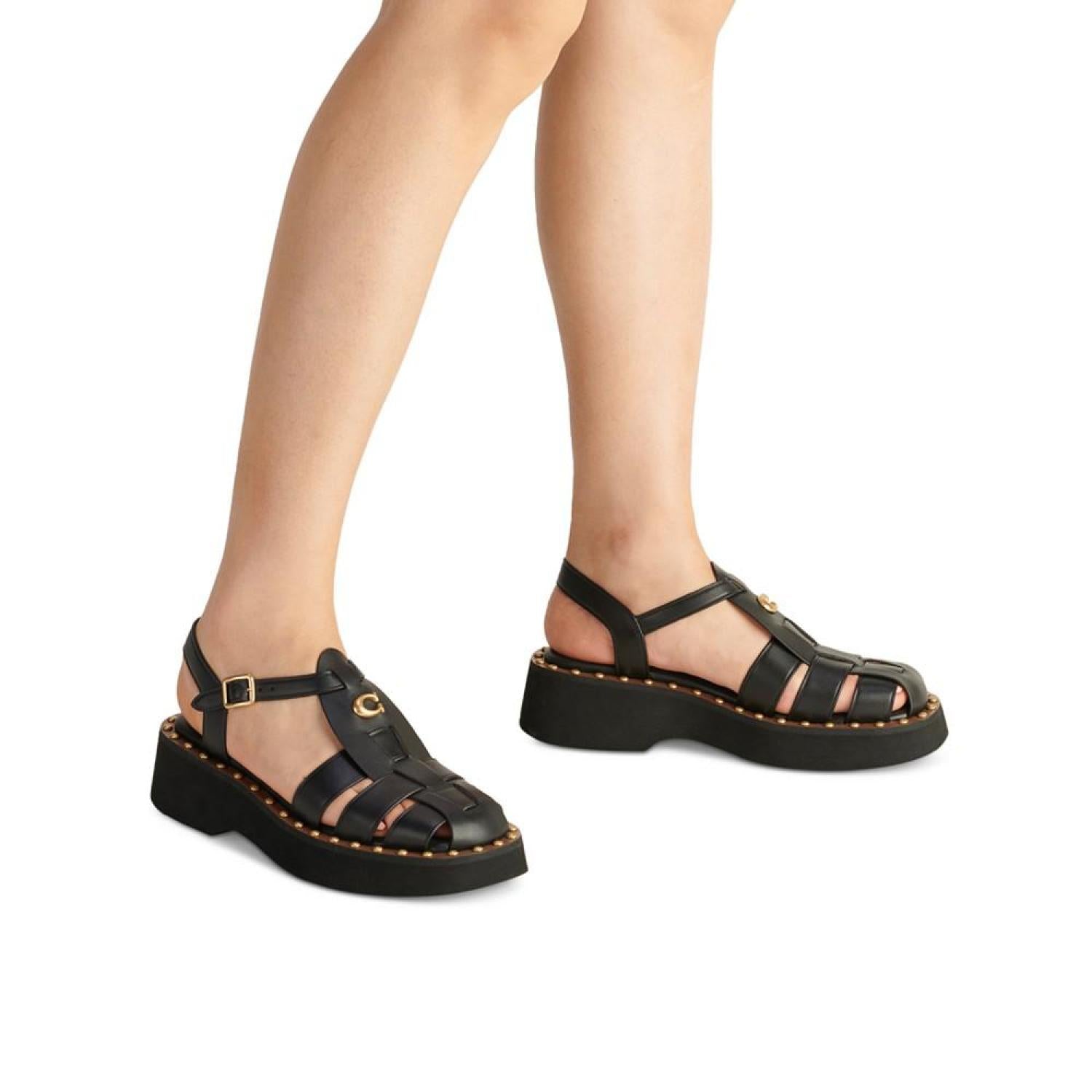 • Gold-tone studs at the welt bring updated flash to a classic fisherman look in the strappy Vivienne sandals by COACH.