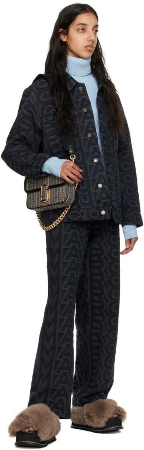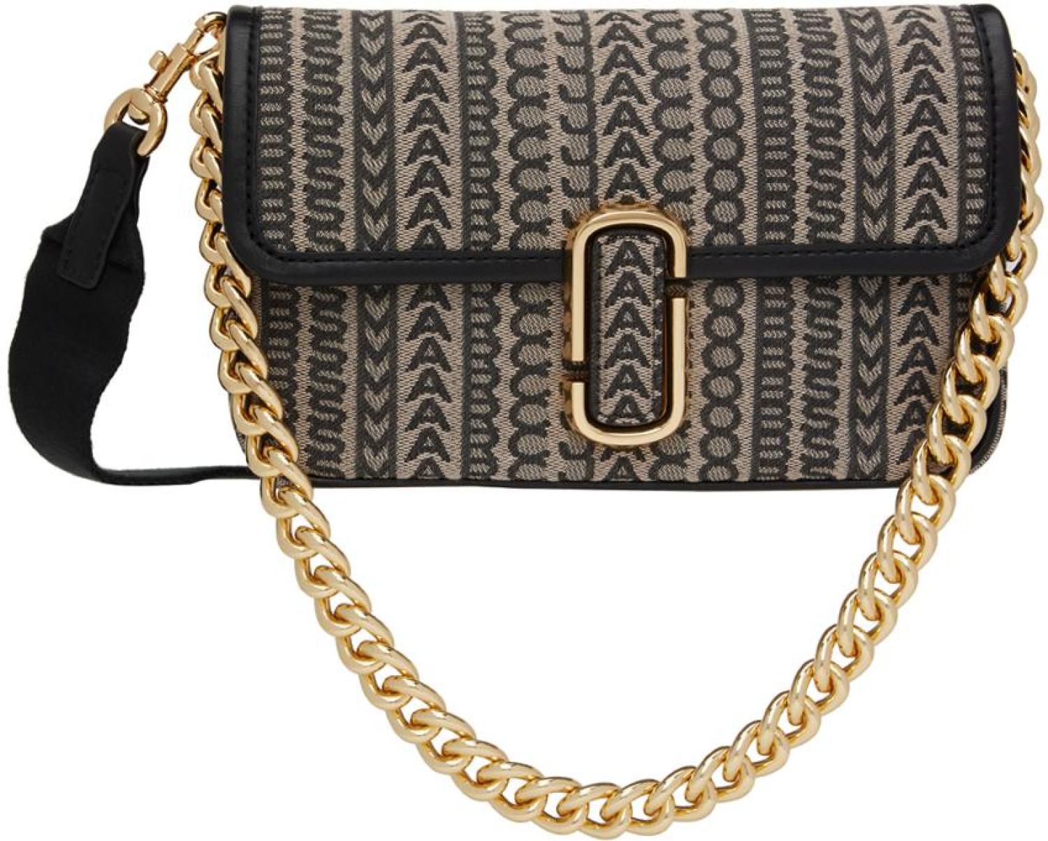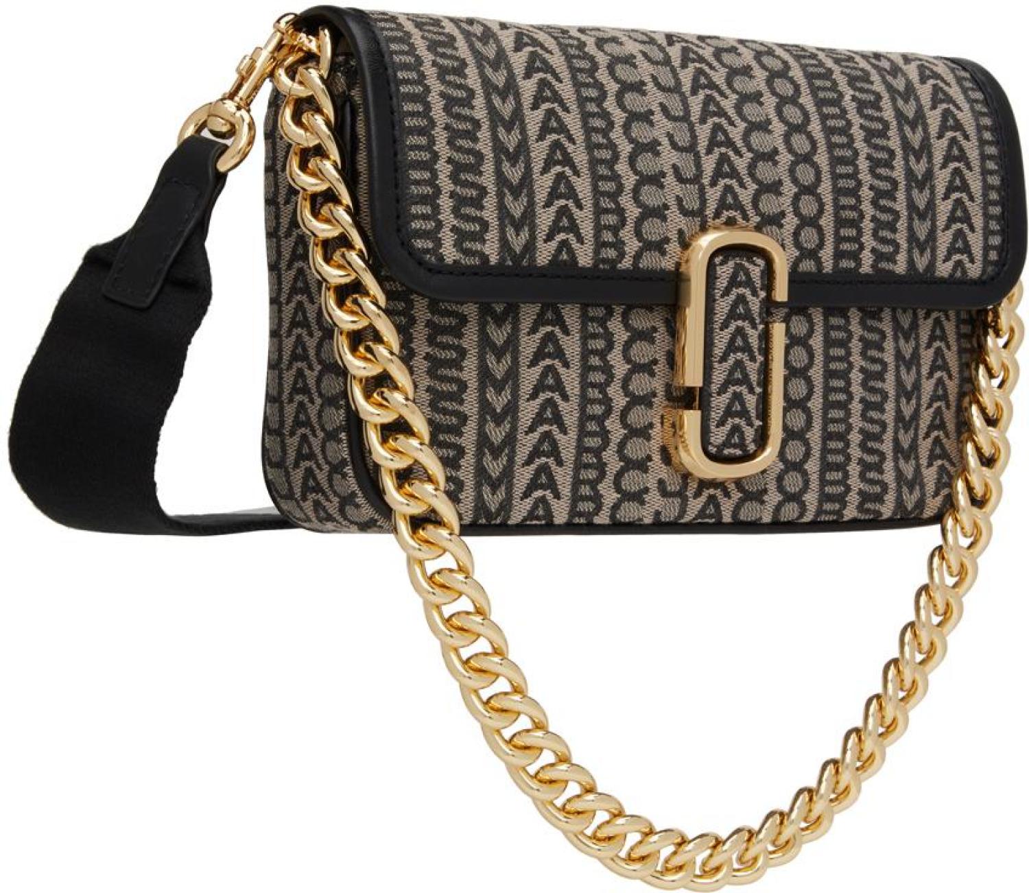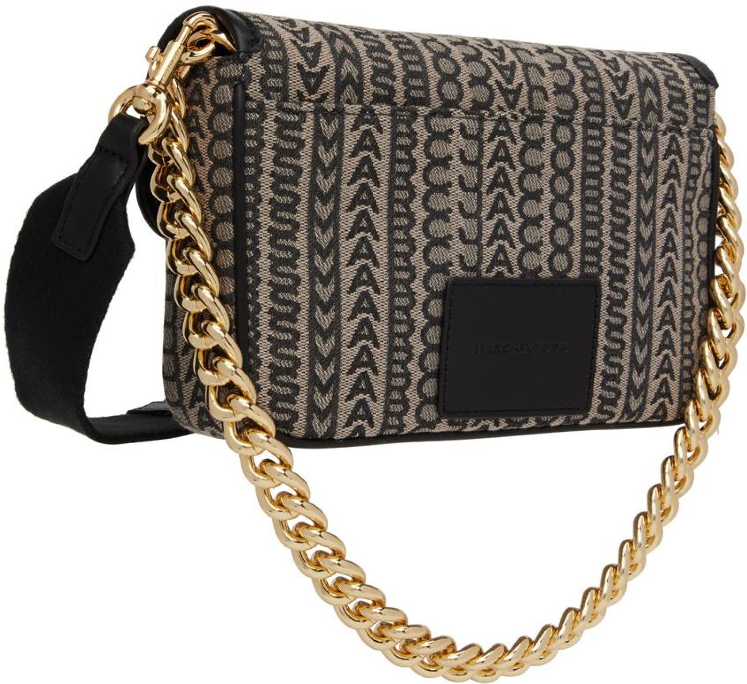 Marc Jacobs Beige & Black 'The Monogram J Marc' Shoulder Bag Cotton canvas shoulder bag in beige and black. Leather trim and logo pattern embroidered throughout. · Fixed curb chain carry handle · Detachable and adjustable webbing shoulder strap · Foldover flap with magnetic press-stud fastening · Patch pocket and leather logo patch at back face · Zip pocket at interior · Faille lining · Logo-engraved gold-tone hardware · H6 x W9.5 x D2 in Supplier color: Beige Multi Textile. Made in Philippines. 231190F048030