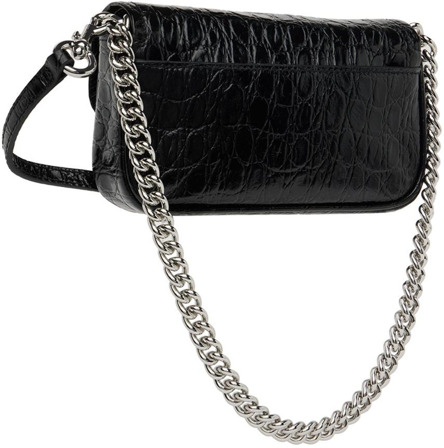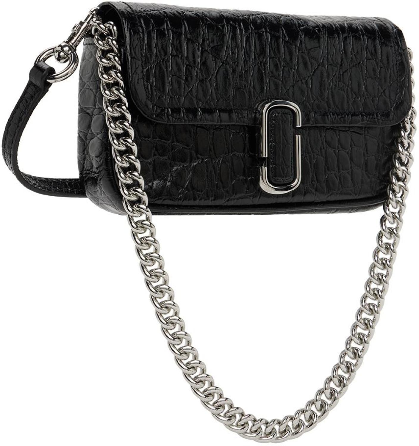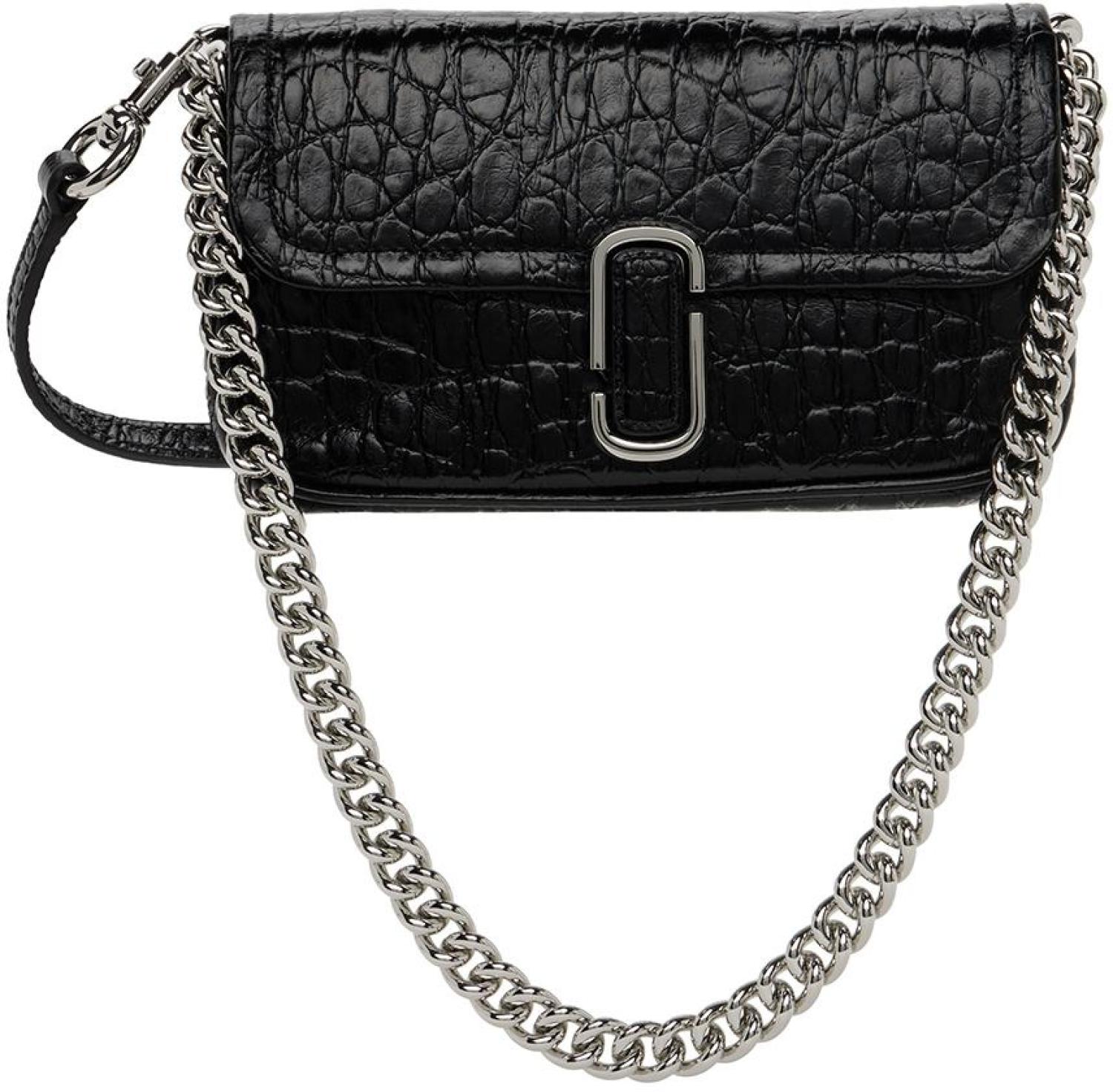 Marc Jacobs Black 'The Croc J Marc Mini' Bag Croc-embossed leather shoulder bag in black. · Curb chain carry handle · Adjustable and detachable shoulder strap · Logo hardware at face · Foldover flap with magnetic press-stud closure · Patch pocket and leather logo patch at back face · Zip pocket and three card slots at interior · Faille lining · Logo-engraved silver-tone hardware · H4.5 x W7.5 x D1.5 in Supplier color: Black Leather. Made in Philippines. 231190F048032