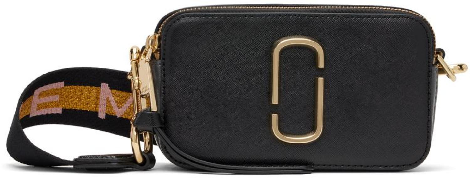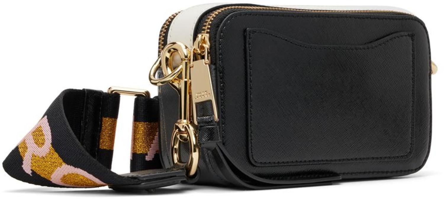 Marc Jacobs Black 'The Snapshot' Bag Saffiano leather shoulder bag in black and off-white. · Detachable and adjustable logo-woven shoulder strap · Logo embossed at top · Logo hardware at face · Patch pocket at back face · Twin zip closures · Patch pocket at two-compartment interior · Cotton faille lining · Logo-engraved gold-tone hardware · H4 x W7 x D2 in Supplier color: New black/Multi Leather. Made in Philippines. 232190F048135