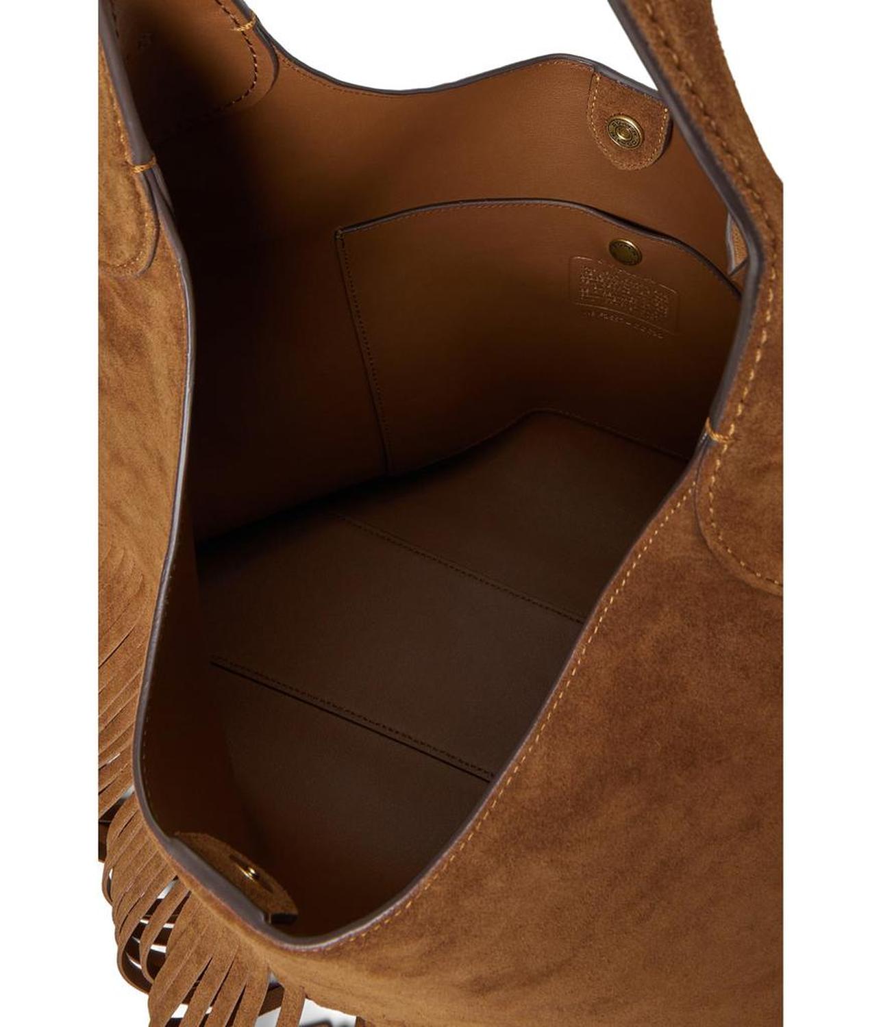 The COACH™ Brooklyn Shoulder Bag 39 With Fringe is a bold blend of boho flair and urban sophistication. Crafted from suede and finished with swingy fringe trim, this generously sized hobo features a spacious interior that fits a 15" laptop, along with an interior snap pocket for easy access to essentials. The magnetic snap closure offers secure yet effortless entry, while the wide shoulder strap ensures comfortable carry throughout your day.