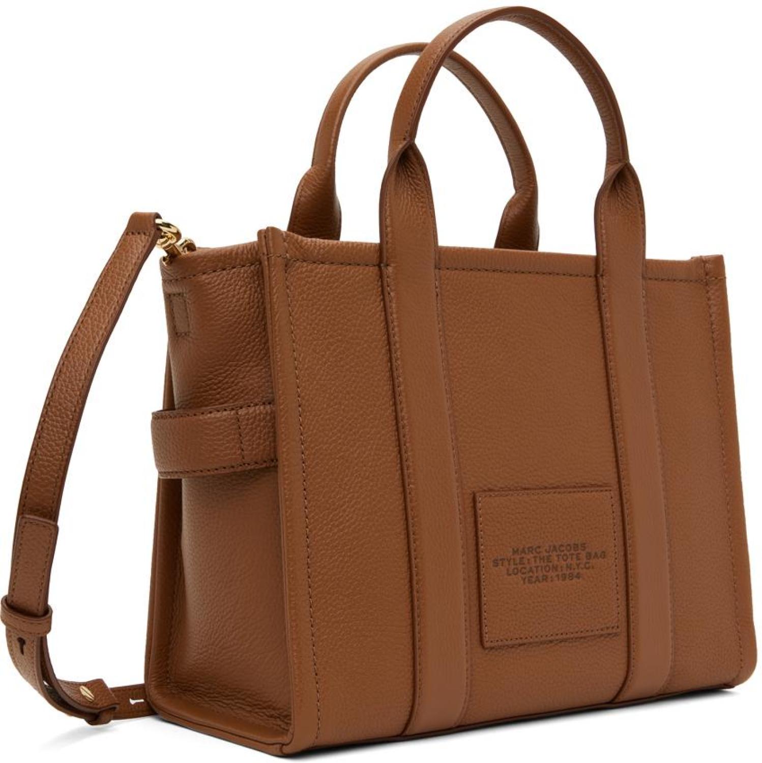Marc Jacobs Brown 'The Leather Medium Tote Bag' Tote Grained leather tote in brown. · Twin rolled carry handles · Adjustable and detachable crossbody strap · Logo embossed at face · Carry handle at side · Logo patch at back face · Leather pads at base · Zip closure · Patch and zip pockets at interior · Twill lining · H9.75" x W13" x D6" Supplier color: Argan oil Leather. Made in Viet Nam. 241190F049070