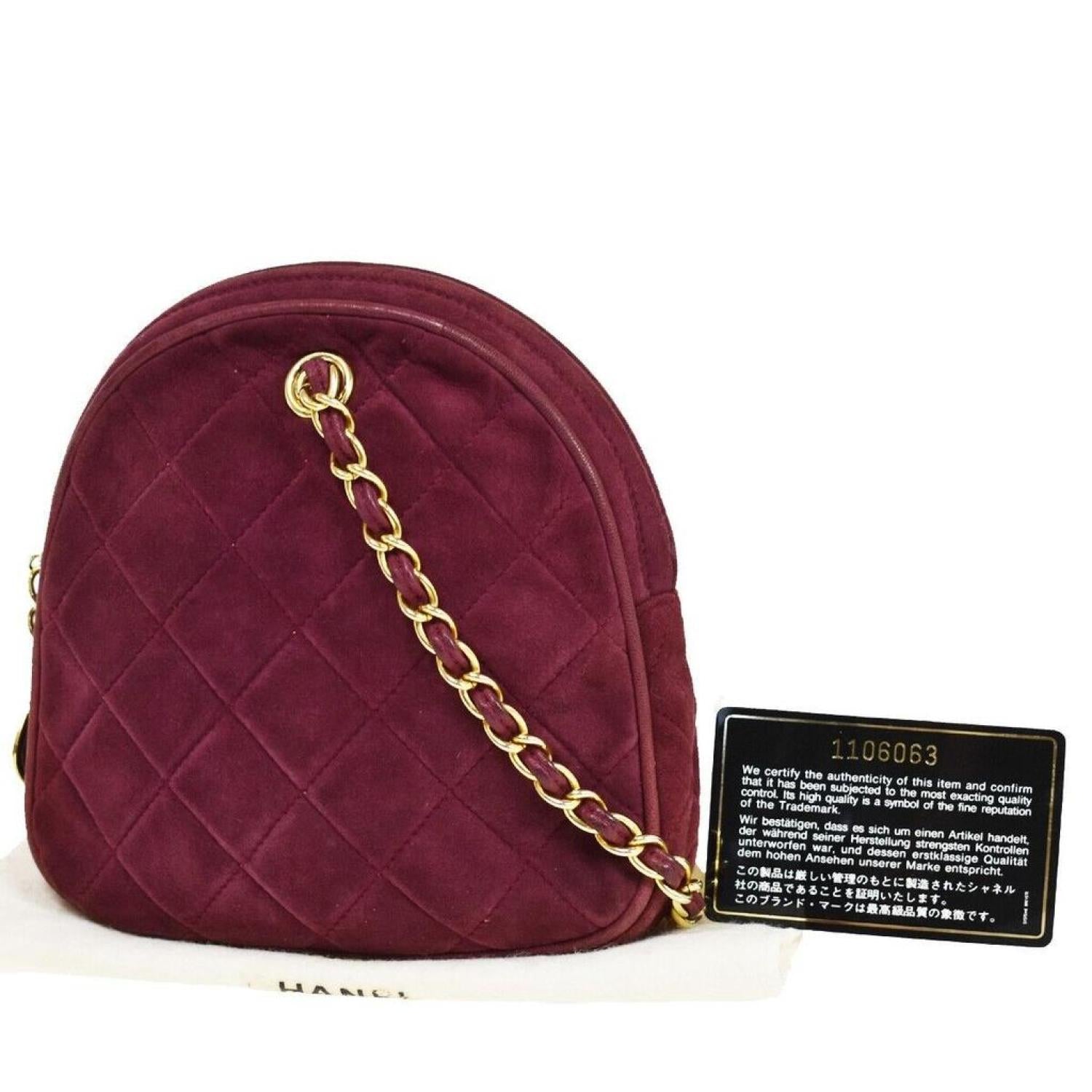 Brand - ChanelModel - MatelasséColor - BurgundyMaterial - SuedeInclusions - guarantee, dust bagDimensions - W 17 x H 17 x D 14 cmSerial number - 1106063Country of origin - ItalyCondition - AB - good condition.Elevate your ensemble with the timeless allure of this Chanel Matelasse Hand Bag, meticulously crafted for women who appreciate sophistication. The rich burgundy exterior and matching leather handle, coupled with the elegant gold-plated hardware, showcase Chanel's commitment to luxury and style. This handbag, part of the Matelasse product line, seamlessly blends fashion and functionality.In terms of condition, it's important to note some signs of wear. There is a minor stain on the outside, adding character to the bag's overall charm. Additionally, the hardware exhibits slight scratching and discoloration, which, while present, does not significantly diminish the bag's timeless appeal. This Chanel Matelasse Hand Bag is a coveted accessory that effortlessly combines classic design with modern elegance.We recommend that you look at all the pictures before making your purchase to ensure that you are satisfied with the condition of the item.